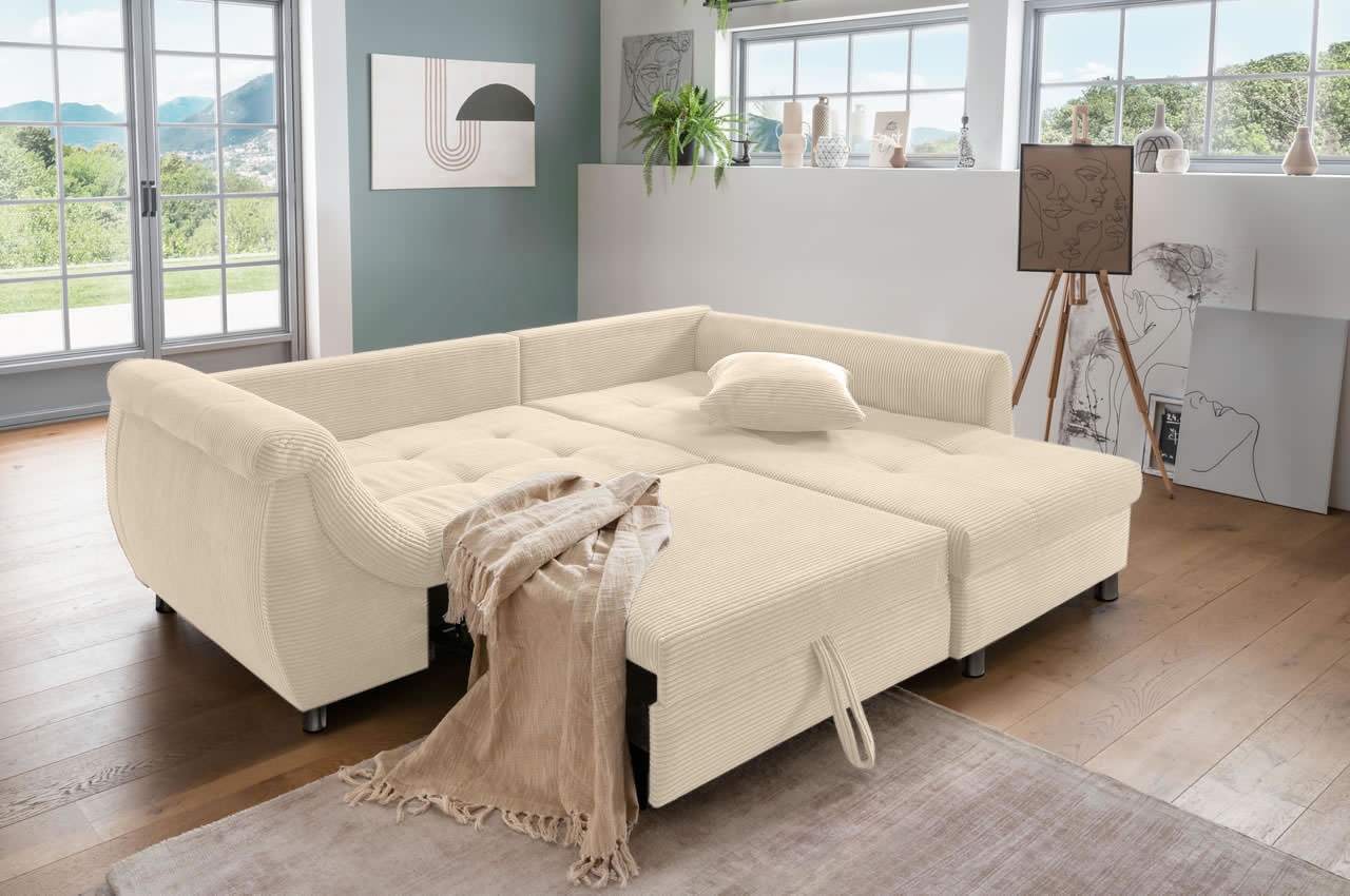 Die Eckcouch verfügt über eine komfortable Schlaffunktion. Gönnen Sie sich oder Ihren Freunden eine erholsame Nacht und genießen den Komfort Ihres neuen Traumsofas. Die Bettfunktion ist kinderleicht aufzubauen - ziehen Sie den Bettauszug unter der linksseitigen Sitzreihe nach vorn heraus und schon ist die bequeme Übernachtungsmöglichkeit einsatzbereit.