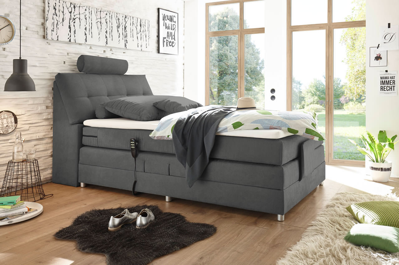 Bett mit Stauraum und Motor - das Boxspringbett Palermo ist als Einzelbett die ideale Schlaflösung für Alleinstehende. Sein abgeschrägtes Kopfteil mit verstellbarer Kopfstütze ist sehr bequem beim Anlehnen. Zudem befindet sich im Kopfteil ein praktisches Staufach, was Ihnen genug Platz für zusätzliche Kissen oder andere Dinge bietet. Einen hervorragenden Komfort ermöglicht die elektrisch verstellbare Liegefläche. Bringen Sie Kopf- und Fußteil unabhängig voneinander in die gewünschte Position, in der Sie am besten schlafen können. Die Steuerung erfolgt über eine Fernbedienung, die seitlich am Bett befestigt werden kann.