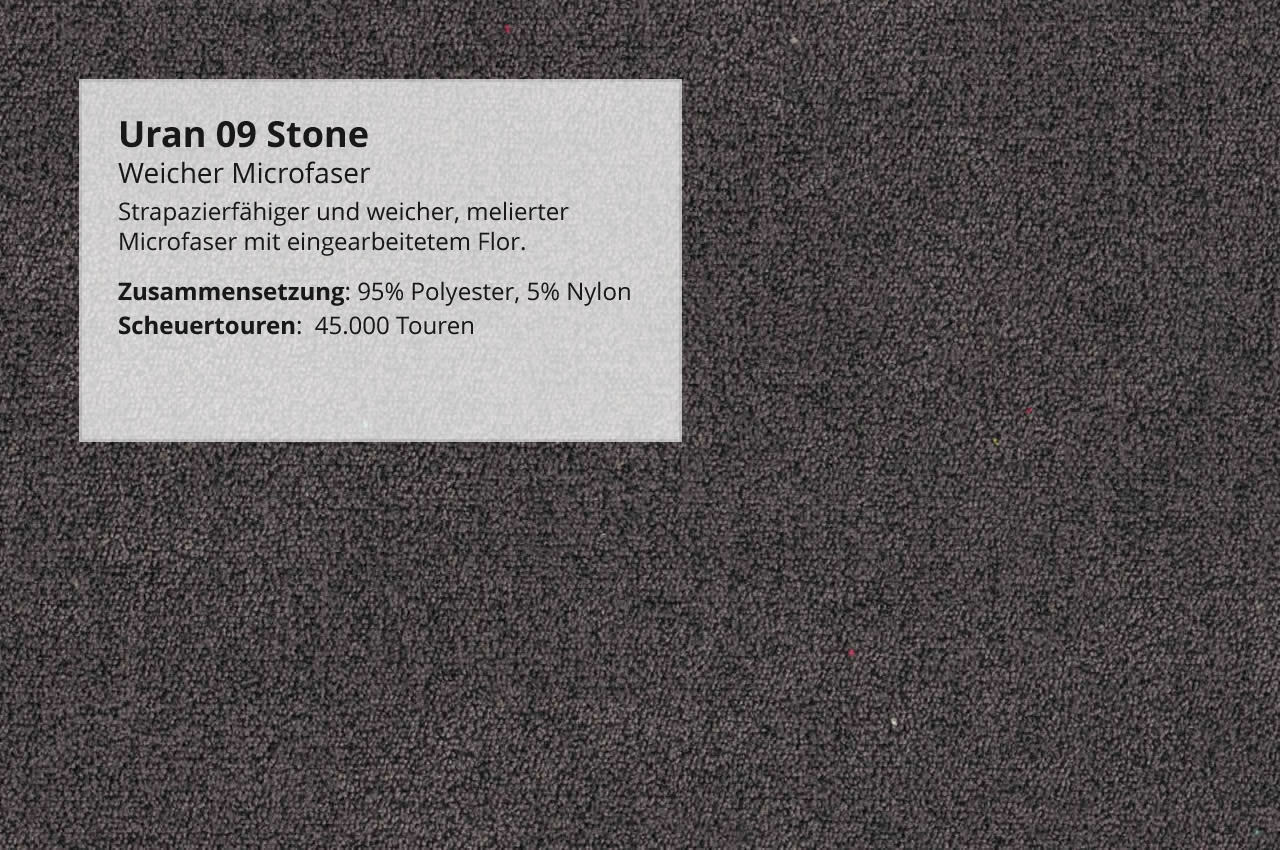 Das Boxspringbett Kuba wird mit dem weichen Microfaser Uran bezogen. Der Stoff ist durch den eingearbeiteten Flor besonders weich. Wählen Sie aus den Farben 01 Silber, 03 Dunkelgrau, 04 Anthrazit, 06 Sand und 09 Stone.