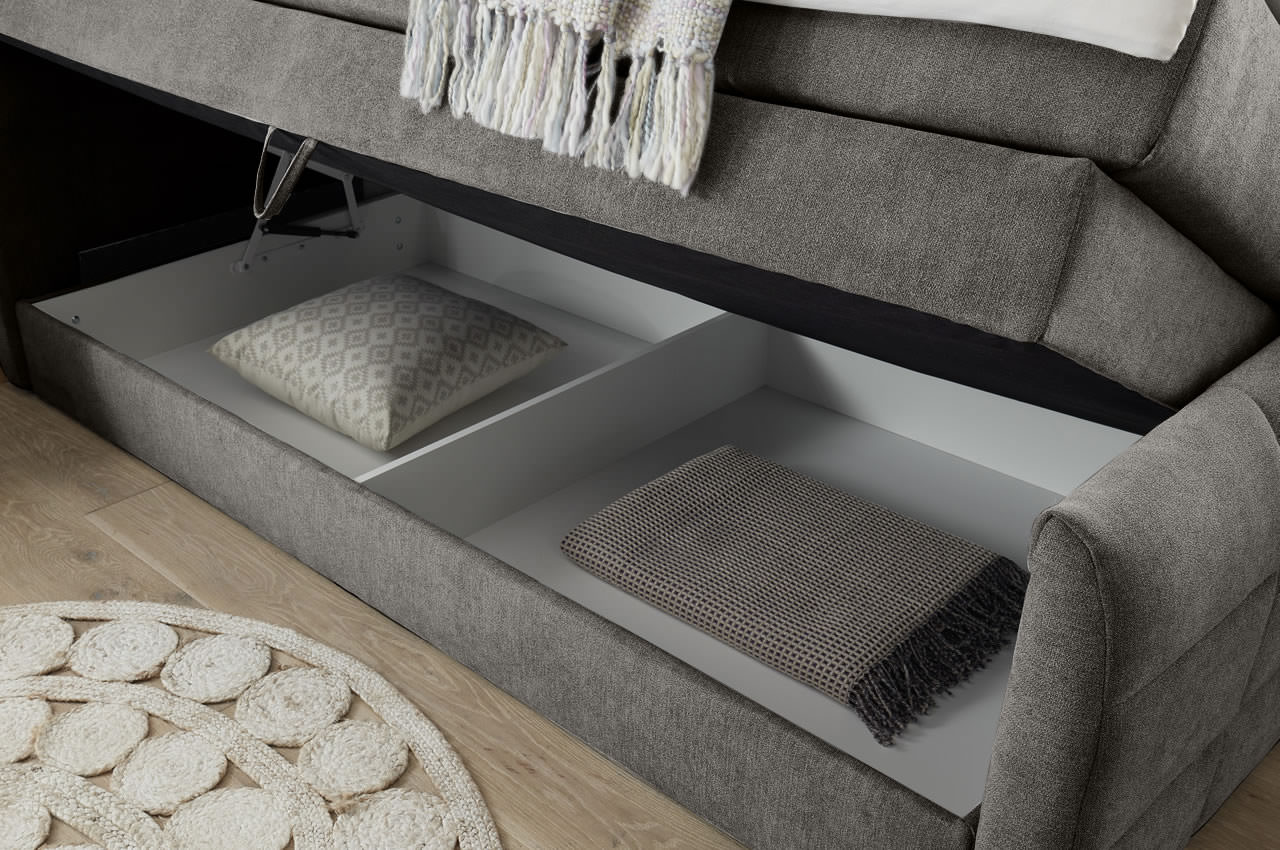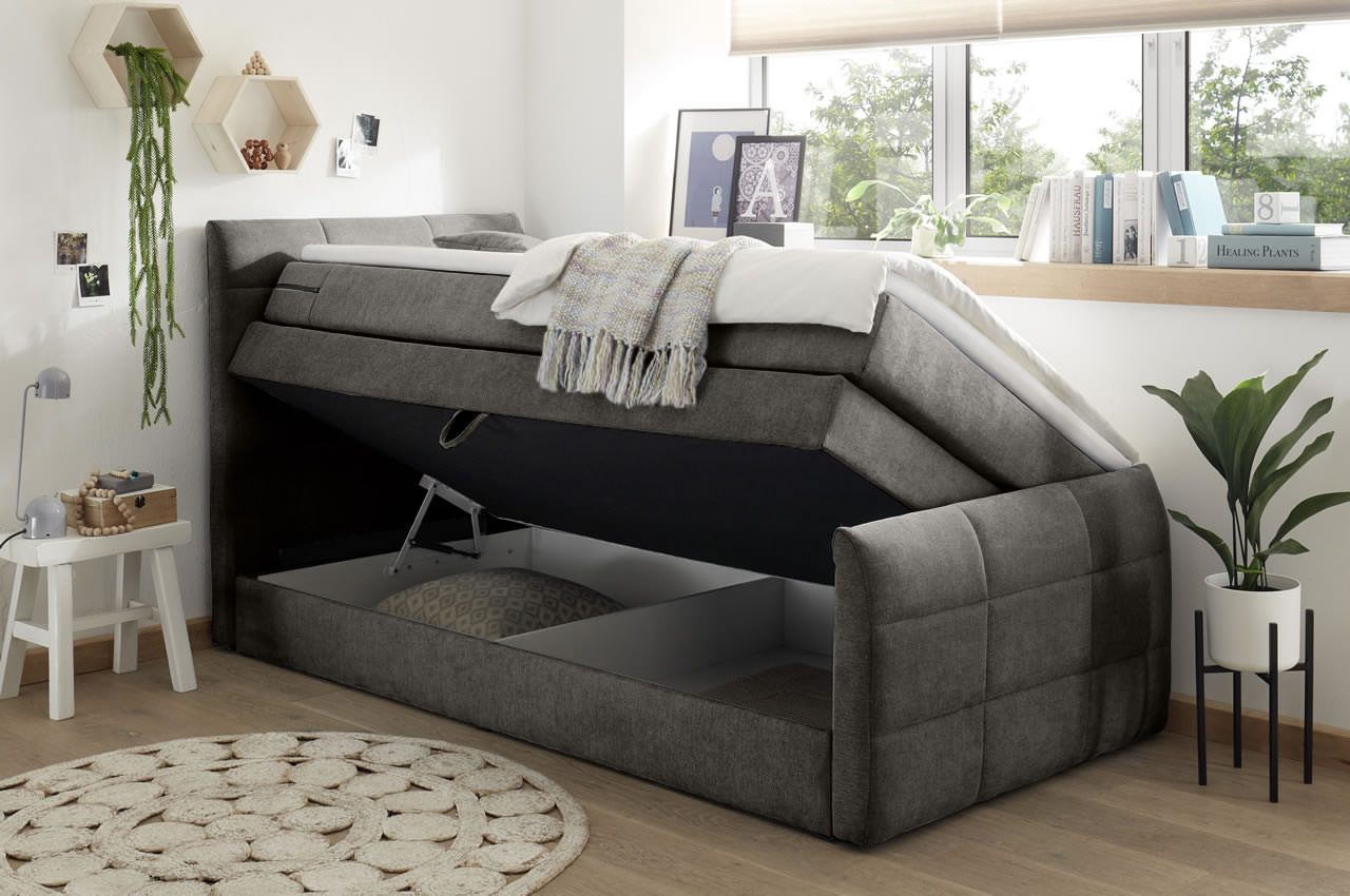 Ein Bettkasten unter der Liegefläche bietet optimalen Stauraum für eine Tagesdecke, Bettwäsche oder andere Utensilien, die Sie am Bett griffbereit verstauen möchten. Durch hochwertige Gasdruckbeschläge ist das Öffnen und Schließen sehr leicht. Der Kasten lässt sich universell sowohl links als auch rechts aufbauen.