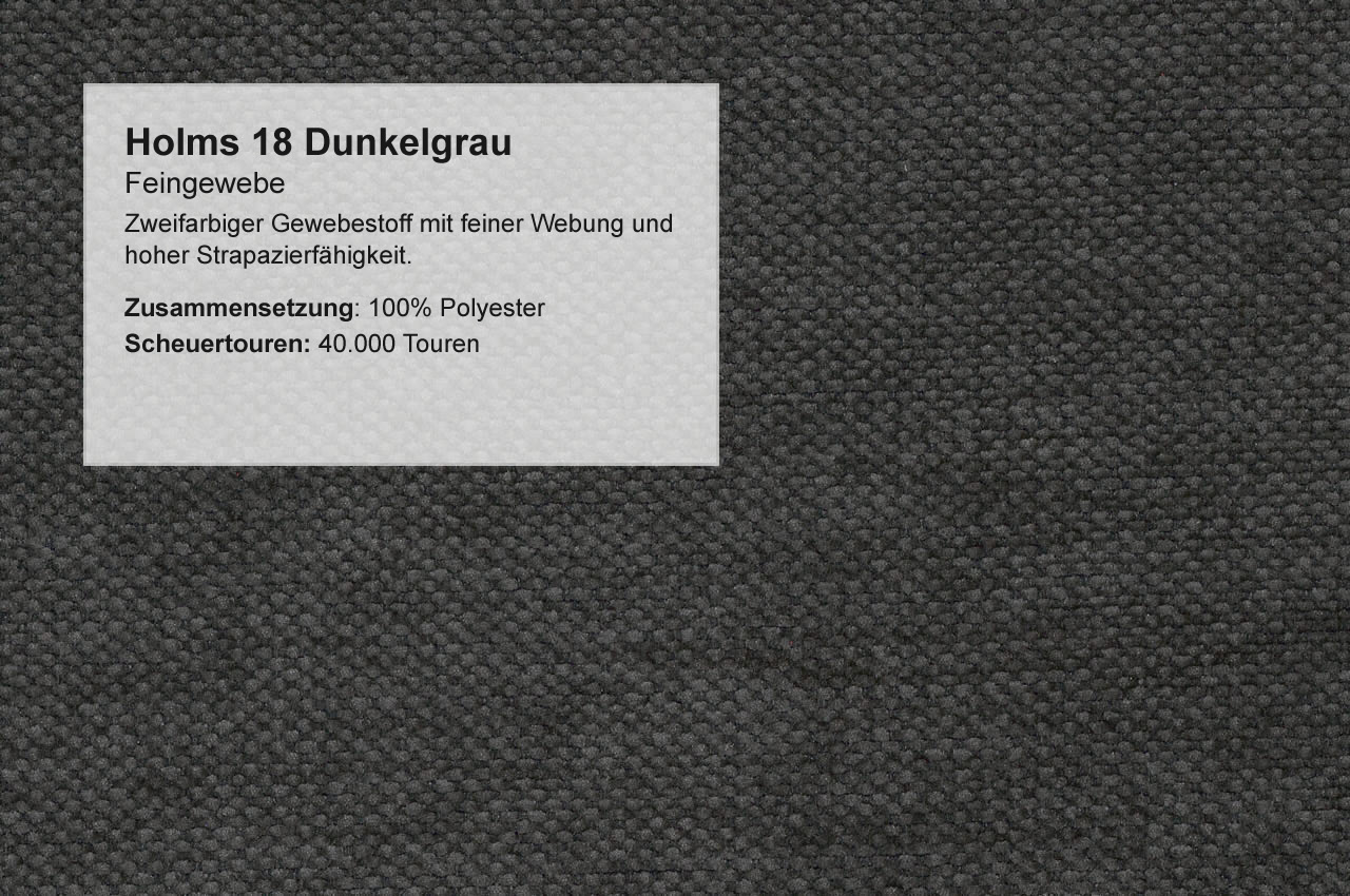 - Feingewebe Holms: Der Stoff besteht aus einem zweifarbigen Gewebe und ist sehr robust. Wählen Sie aus den Farben 04 Silbergrau, 05 Hellgrau, 18 Dunkelgrau und 22 Creme.