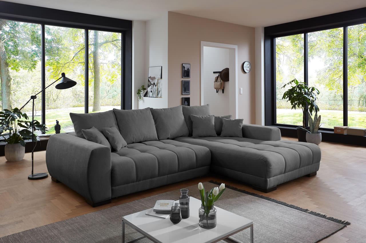 - Kuschelige Kissen: Die gemütlichen Rückenkissen verleihen dem Ecksofa einen extrem gemütliche Ausstrahlung. Kleinere Zierkissen runden das Gesamtbild ab, sind ein schickes Accessoire und unterstreichen den kuscheligen Look.