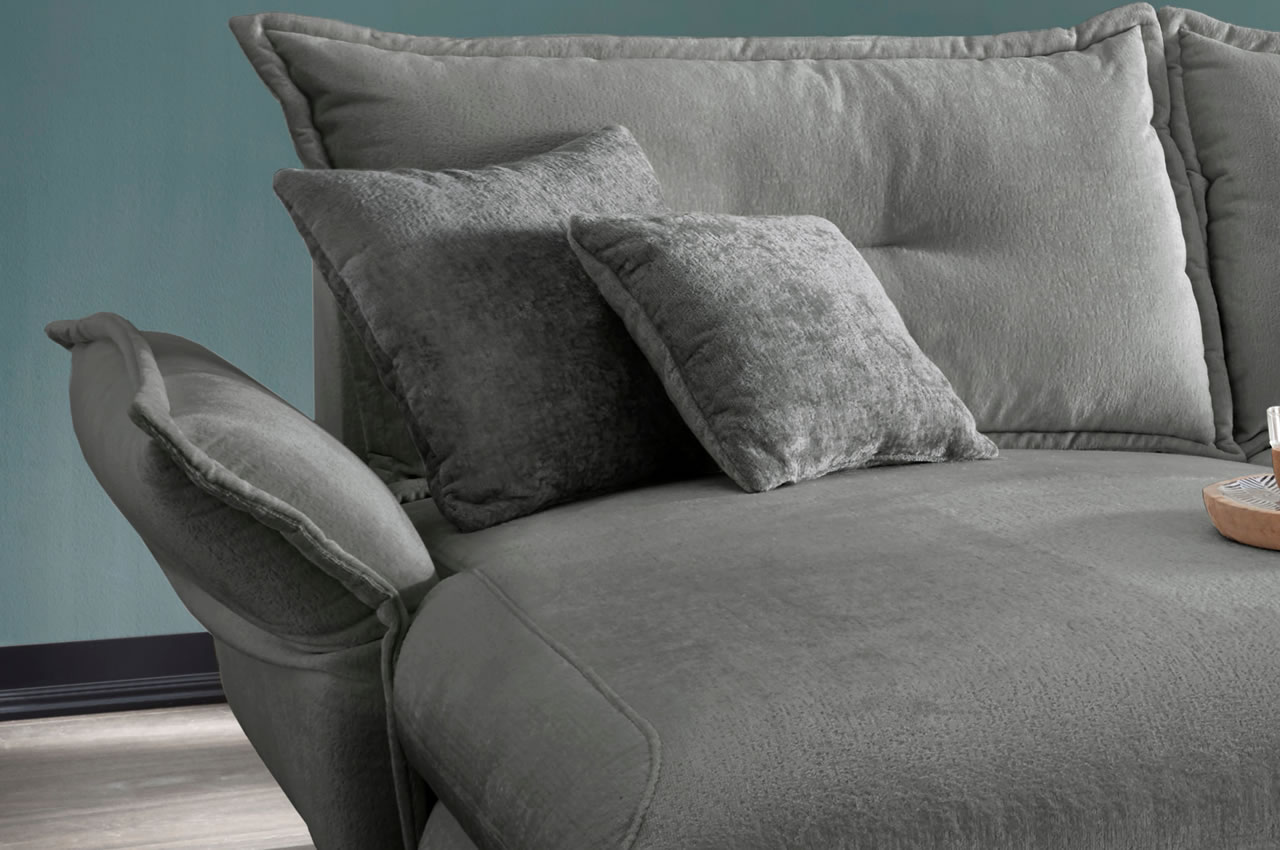 Hinweis: Bei einer Änderung der Beispielvarianten werden alle vier Zierkissen im ausgewählten Möbelstoff geliefert. Bei beidseitig ausgeklappten Armlehnen beträgt die Sofabreite insgesamt ca. 283 cm.