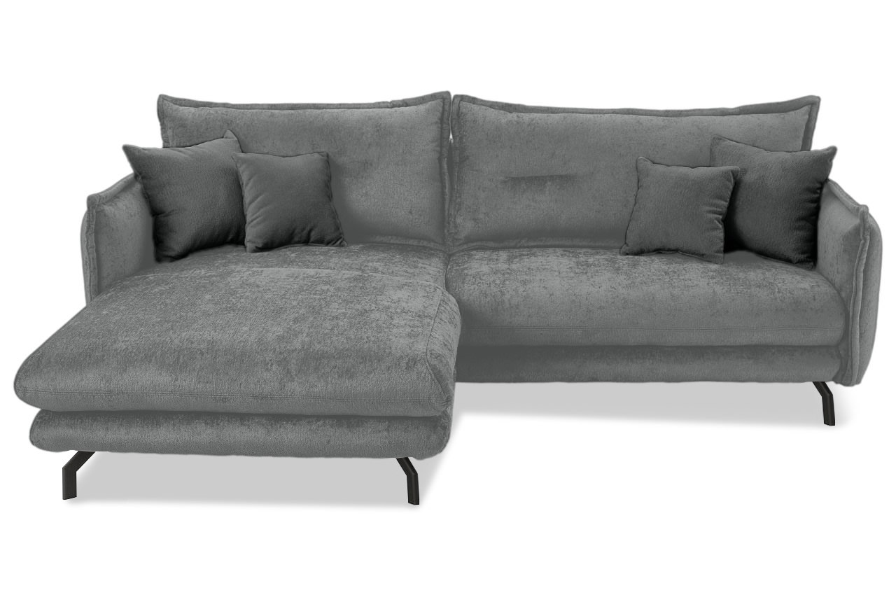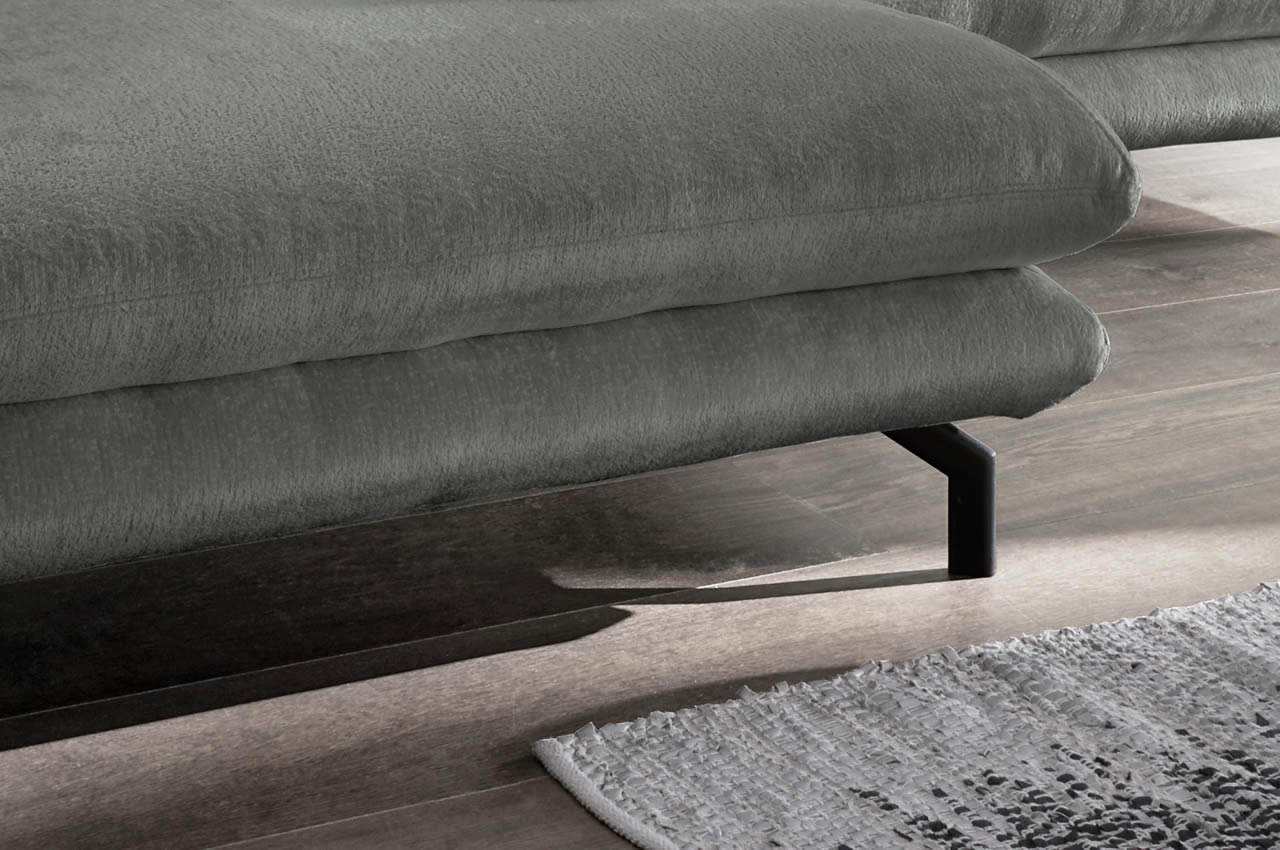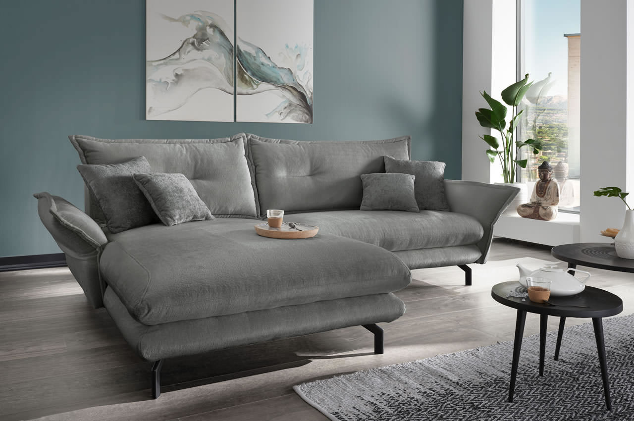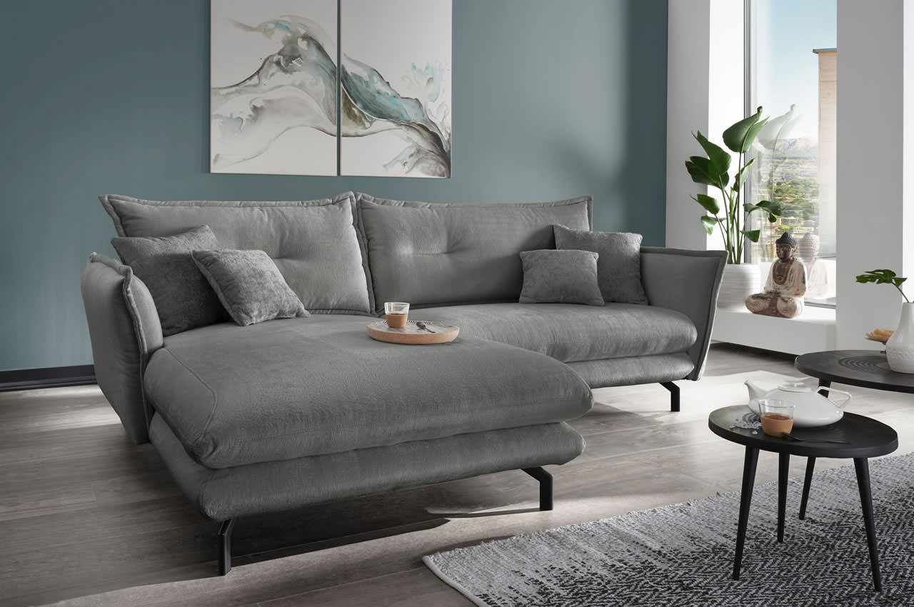Elegantes Design-Sofa - das Ecksofa Lava von Benformato strahlt Eleganz und Leichtigkeit aus. Seine schlanken Metallfüße unterstreichen den stilvollen Charakter. Die klappbaren Armlehnen sind perfekt geeignet, wenn Sie bei einem Nickerchen den Kopf entspannt ablegen möchten. Diese Eckgarnitur ist ein echter Blickfang und wird Ihr Wohnzimmer mit Eleganz füllen.