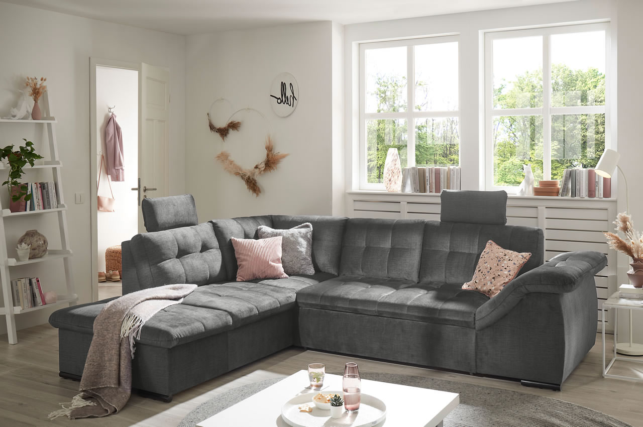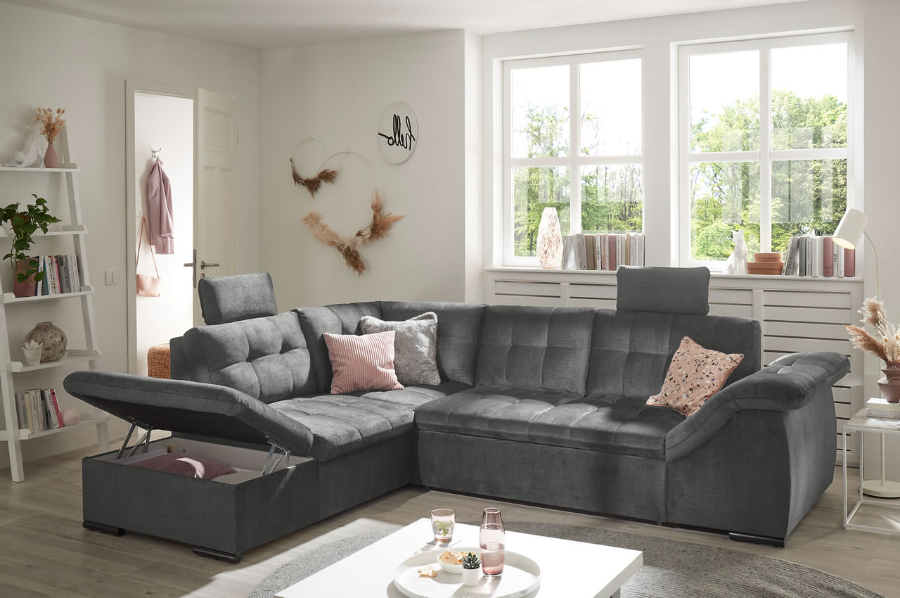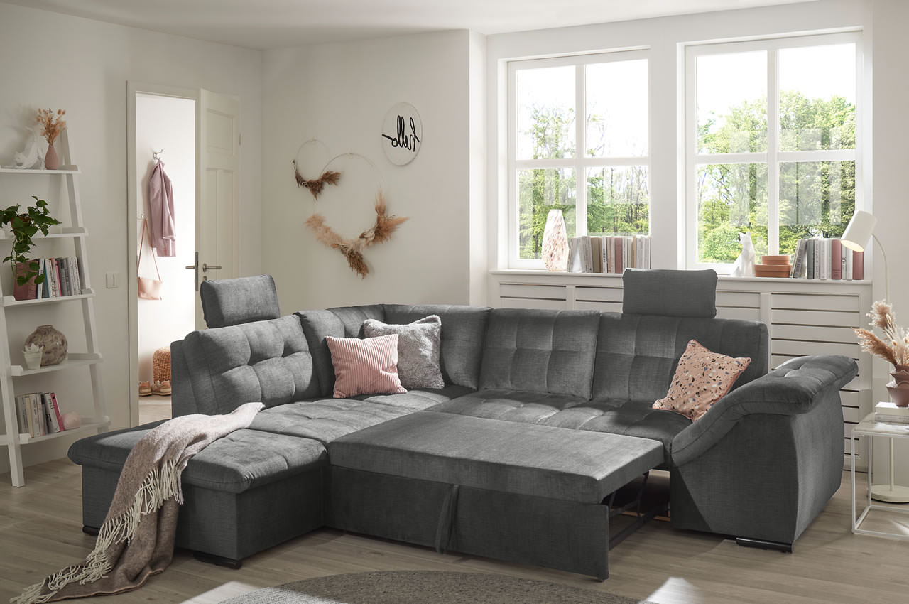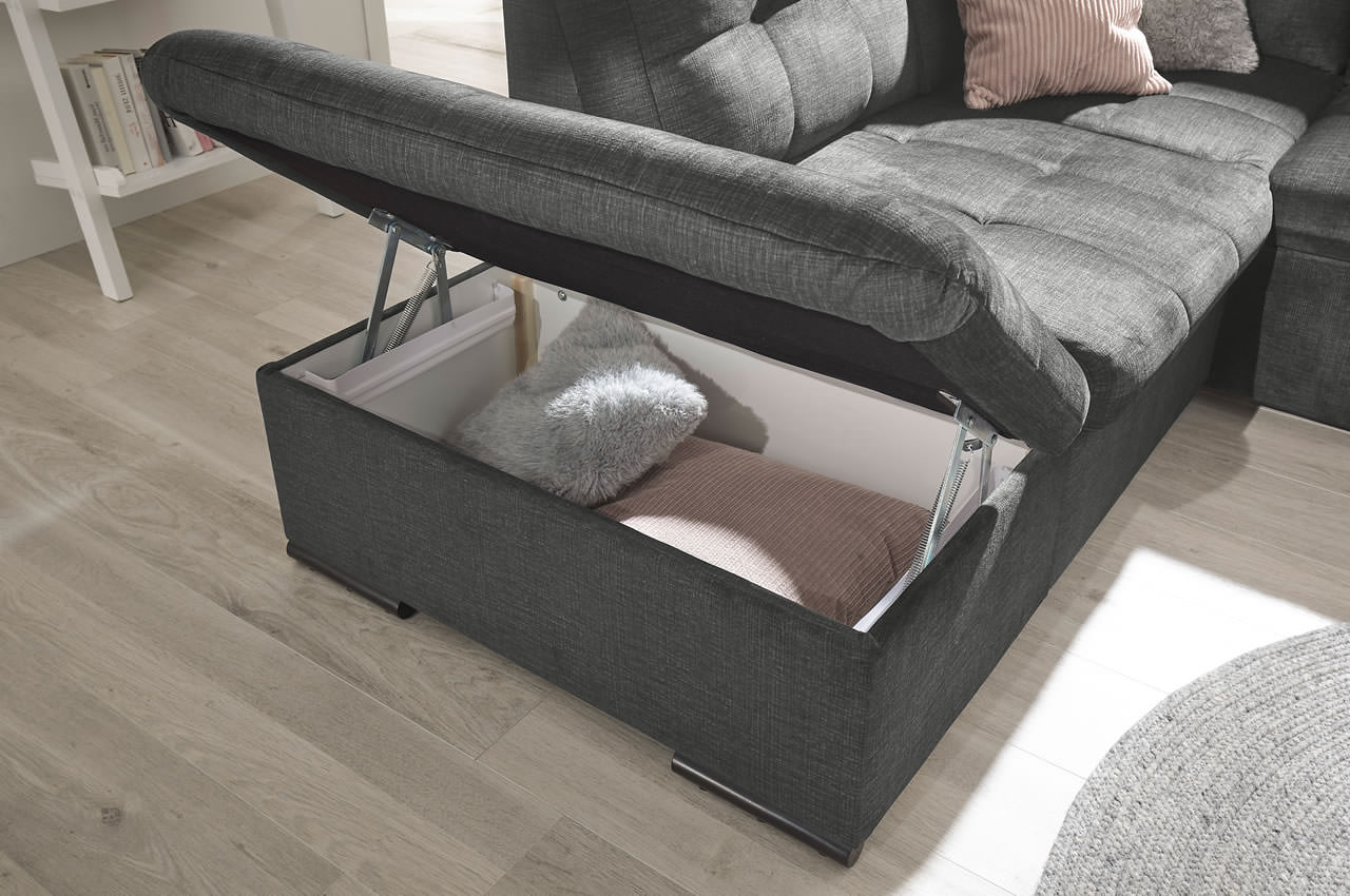 - Schlaffunktion mit Bettkasten: Für besonders gemütliche Abende verwandeln Sie das Sofa mit wenigen Handgriffen in eine große Liegefläche. Kissen und Decken lassen sich im geräumigen Bettkasten verstauen.