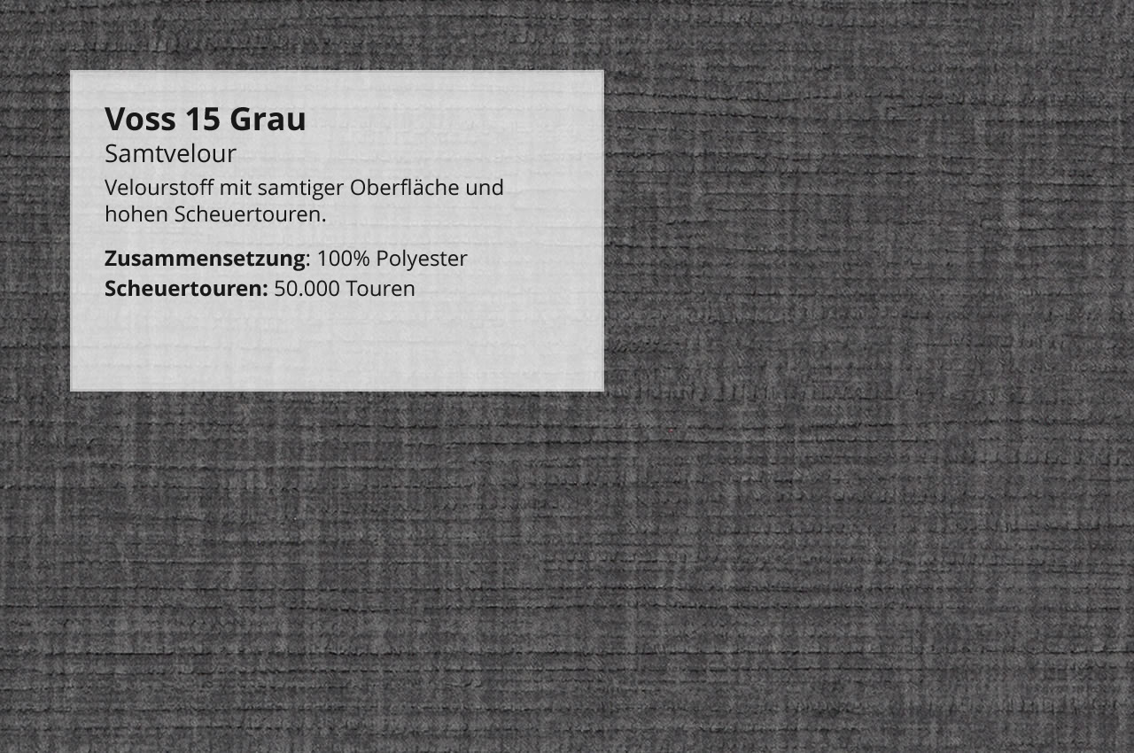 - Samtvelour Voss: Der Stoff hat eine besonders weiche Oberfläche in stilvoller Samt-Optik. Er steht in den Farben 07 Silber, 15 Grau, 18 Schwarz, 38 Stone und 77 Winter Moos zur Auswahl.