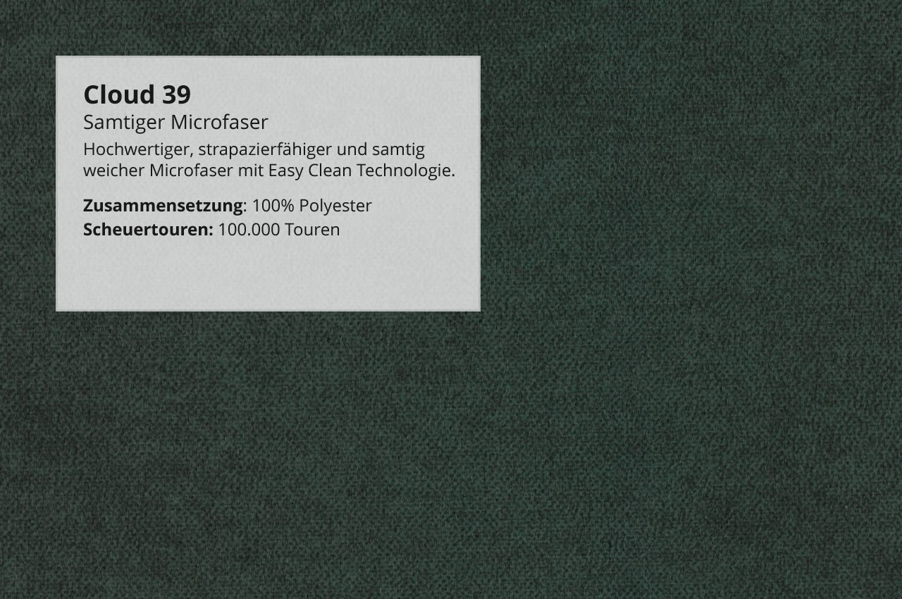 - Samtiger Microfaser Cloud: Der Bezug ist extrem robust und durch eine Easy-Clean-Oberfläche leicht zu reinigen. Wählen Sie aus den Farben 03 Beige, 39 Petrol, 81 Hellgrau, 82 Grau und 91 Anthrazit.