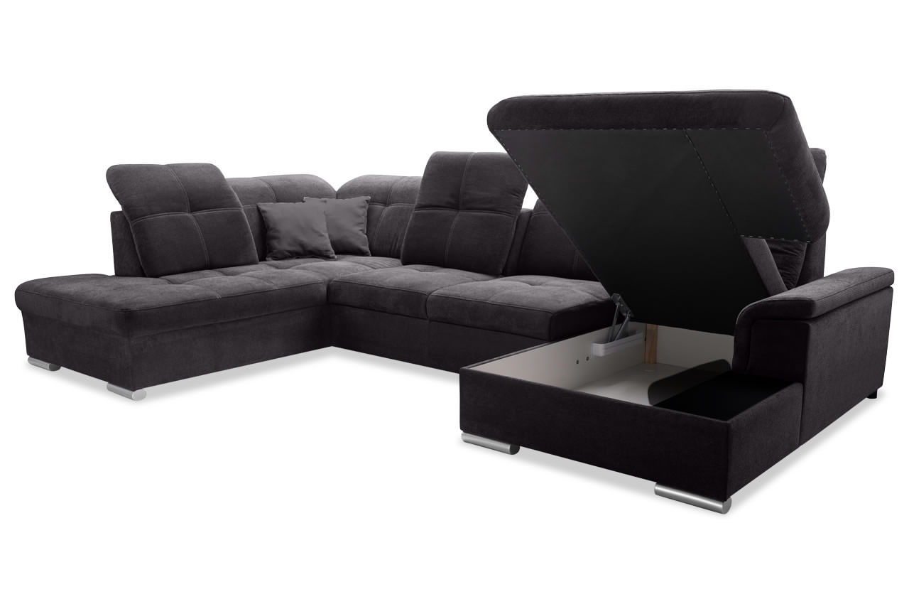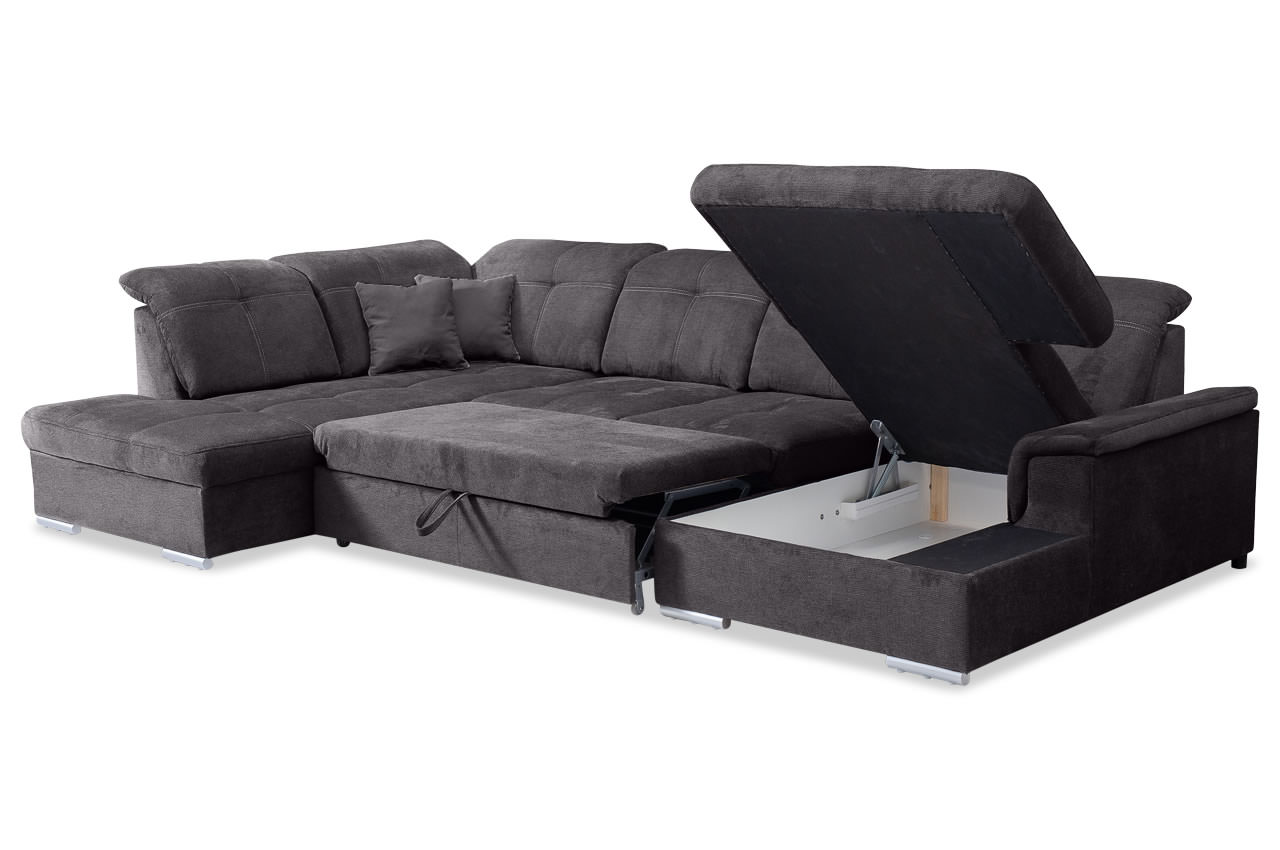 Mit der Schlaffunktion und dem geräumigen Bettkasten unter der rechtsseitigen Recamiere steht Ihnen die Wohnlandschaft auch für die Gästebettnutzung zur Verfügung. Verwandeln Sie die Garnitur im Handumdrehen in eine große Liegefläche, auf der Ihre Gäste bequem übernachten können und Sie selbst am Abend mit den Liebsten einen kuscheligen Abend verbringen können. Decken und Bettzeug für Ihre Gäste verstauen Sie im praktischen Stauraum.