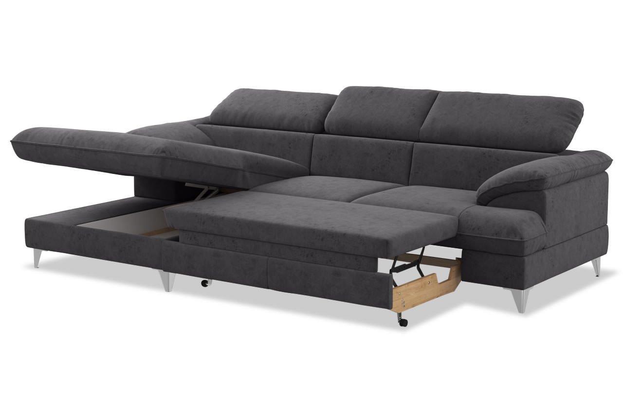 - Mit Schlaffunktion und Bettkasten: Nutzen Sie den Bettauszug, um abends mit Ihren Liebsten einen gemütlichen Fernsehabend zu verbringen. Im ausgezogenen Zustand bietet das Sofa eine große Liegefläche, auf der Sie gemeinsam liegen können. Auch als Gästebett bietet das Sofa optimalen Komfort. Im Bettkasten, der sich unter der Recamiere befindet, findet sich genug Platz für Decken und Kissen.