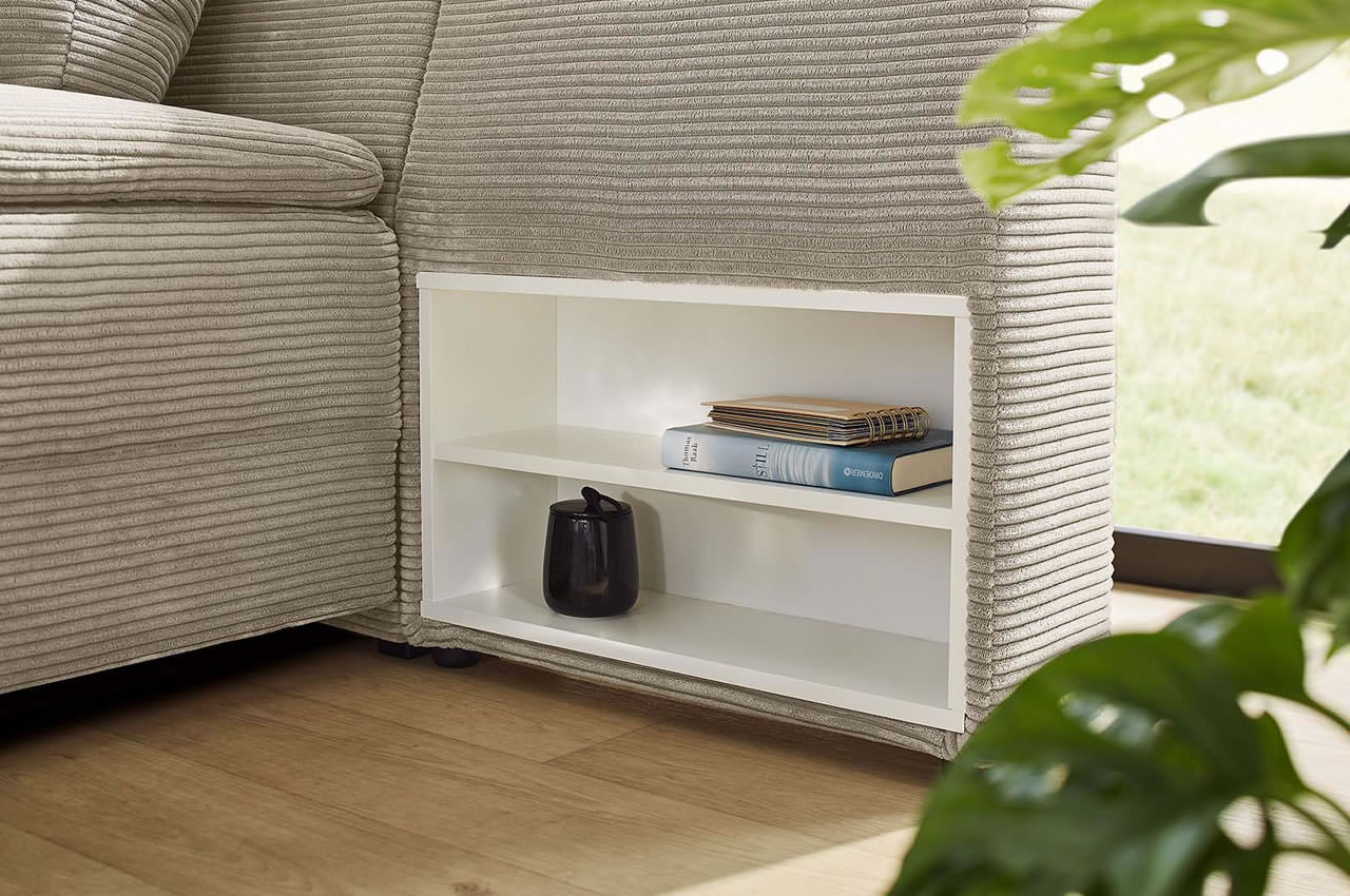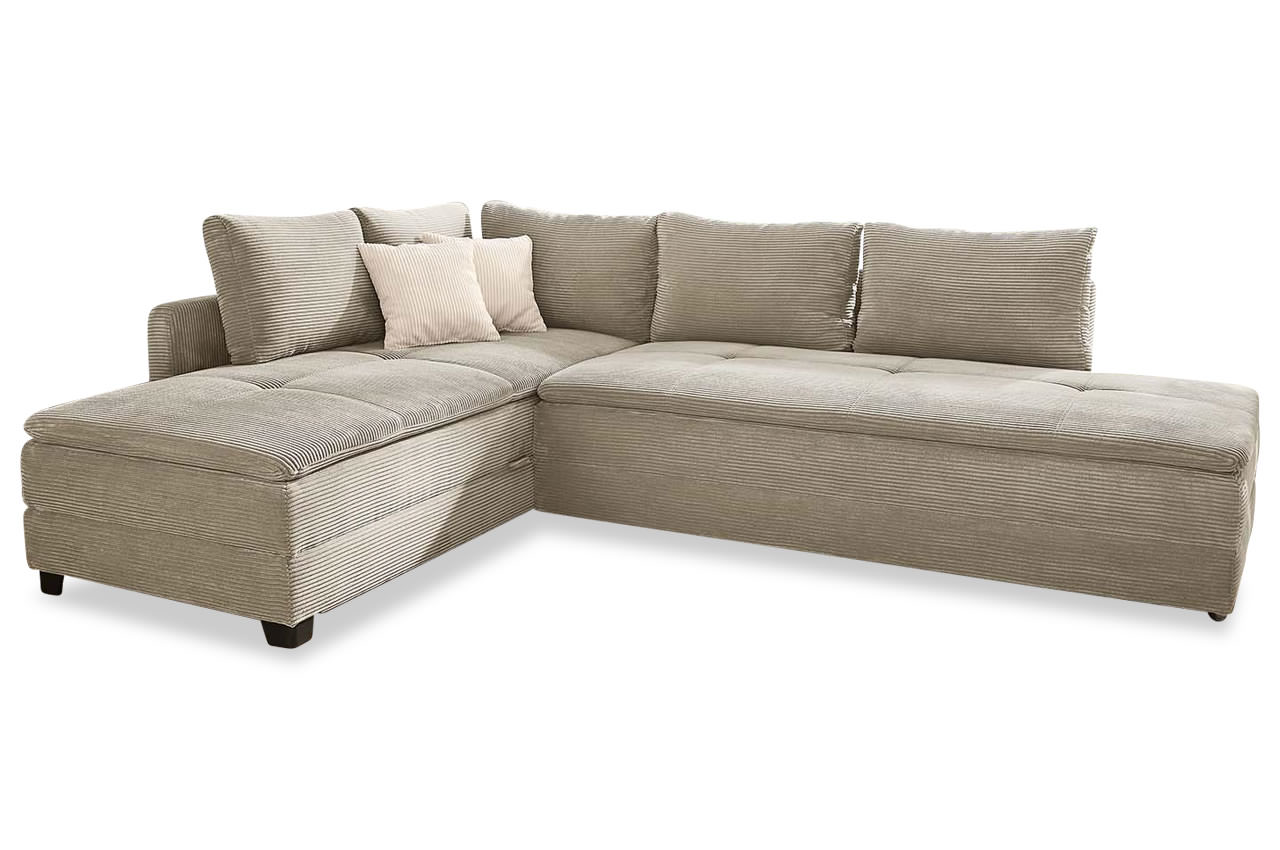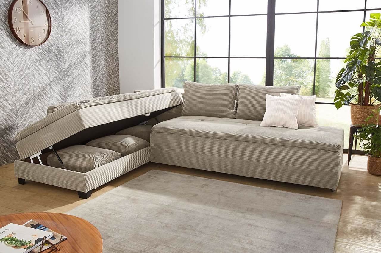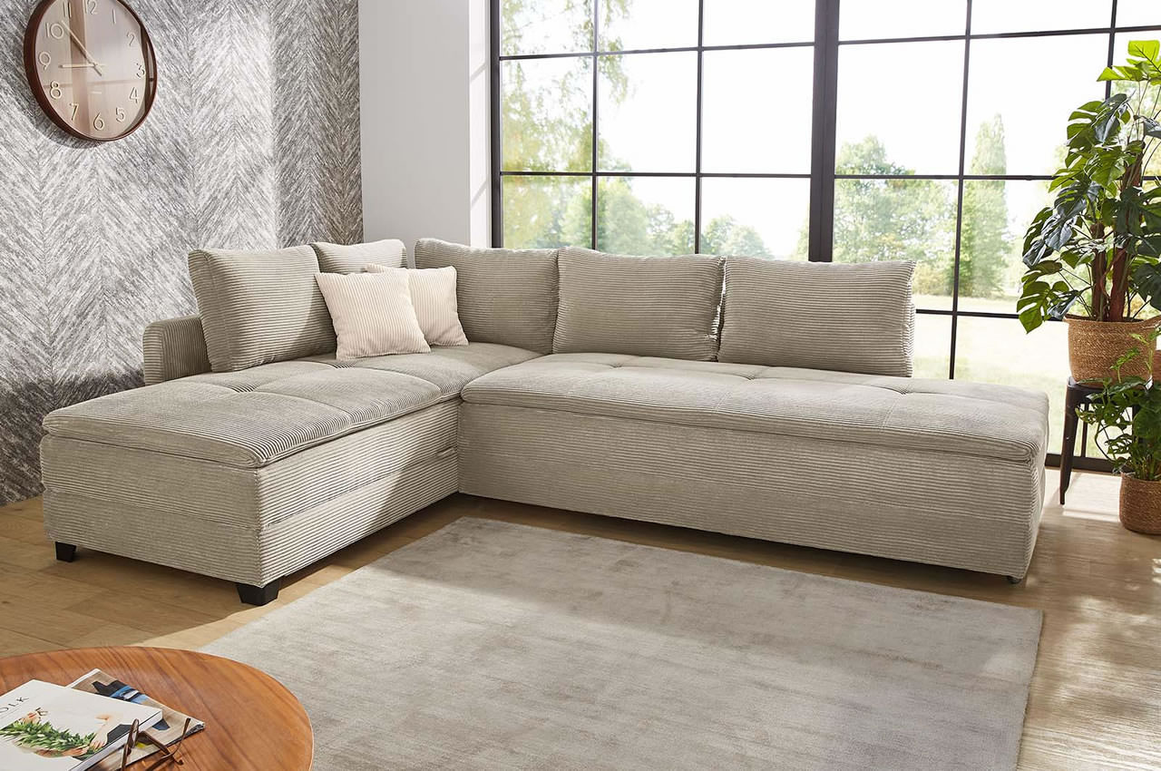 - Cord / Modell Ecksofa Madrid: Der hochwertige Cordstoff hat eine angenehm weiche Oberfläche mit einer hohen Abriebfestigkeit. Wählen Sie aus den Farben 426-03 Grün, 426-09 Grau, 426-17 Greige und 426-18 Taupe. In dieser Ausführung besitzt das Sofa Kunststofffüße in Schwarz.