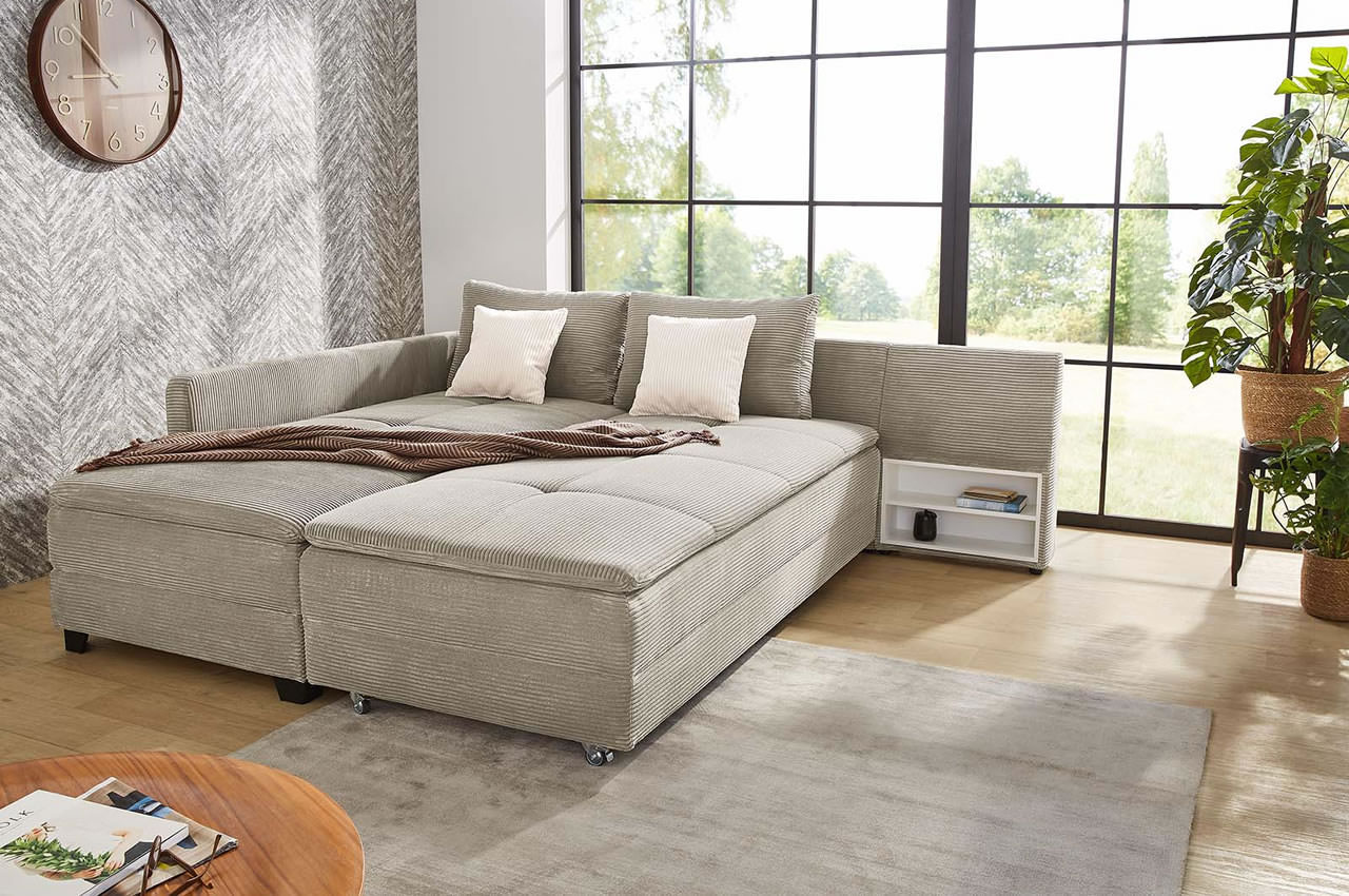 Schickes Sofa mit Umklapp-Boxspring-Schlaffunktion. Das Ecksofa Modena ist eine grandiose Lösung für Räume, in denen eine hochwertige Sitz- und Schlafmöglichkeit gewünscht ist. Der Vorteil bei diesem Modell ist, dass sich das rechtsseitige Schwenkteil über einen Wippbeschlag nach links eindrehen lässt und Sie somit eine vollwertige Liegefläche erzeugen, die dem Komfort eines herkömmlichen Bettes entspricht. Super praktisch ist auch das versteckte Regal, dass durch Umklappen des Schwenkteils zum Vorschein kommt.