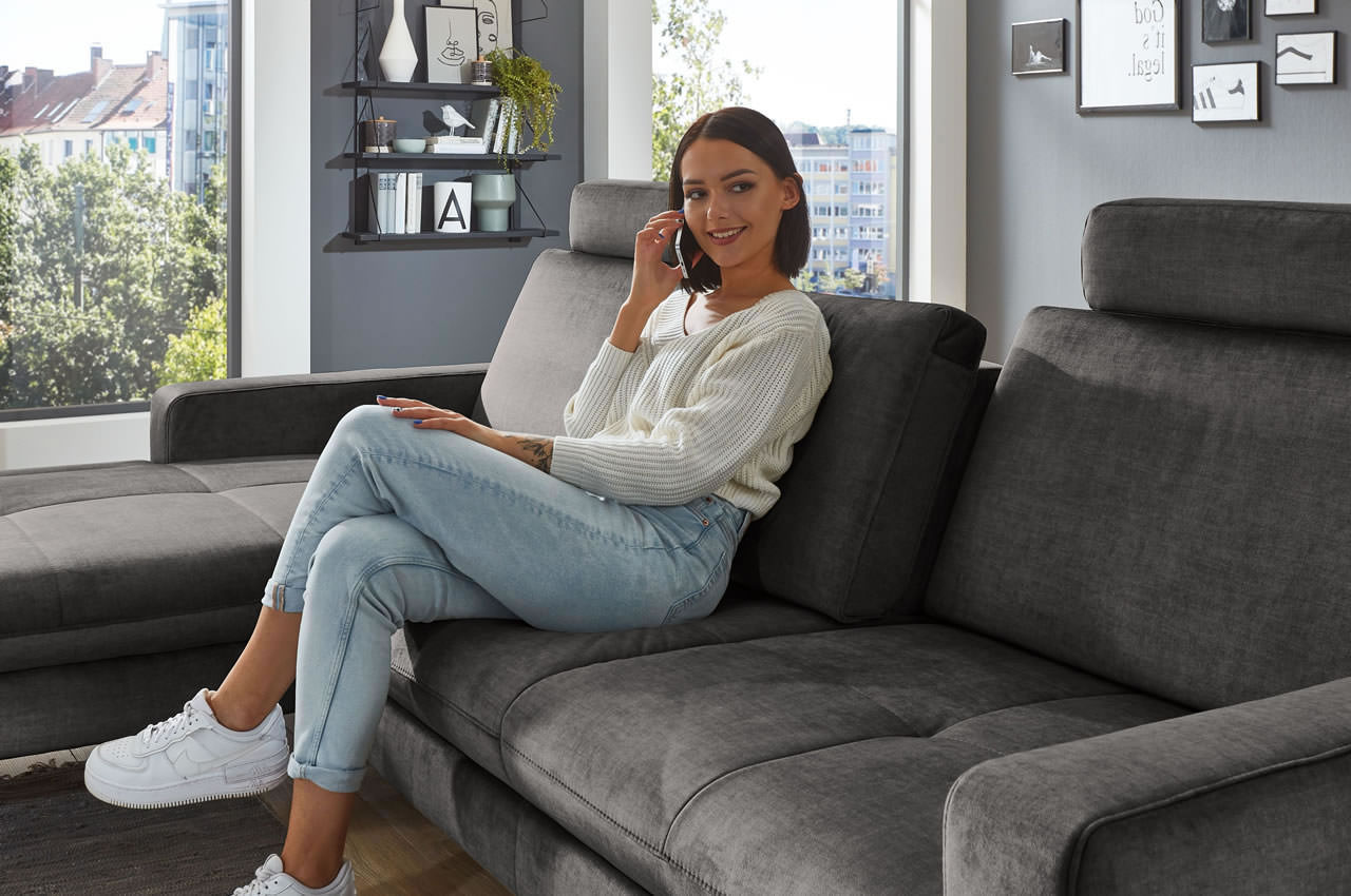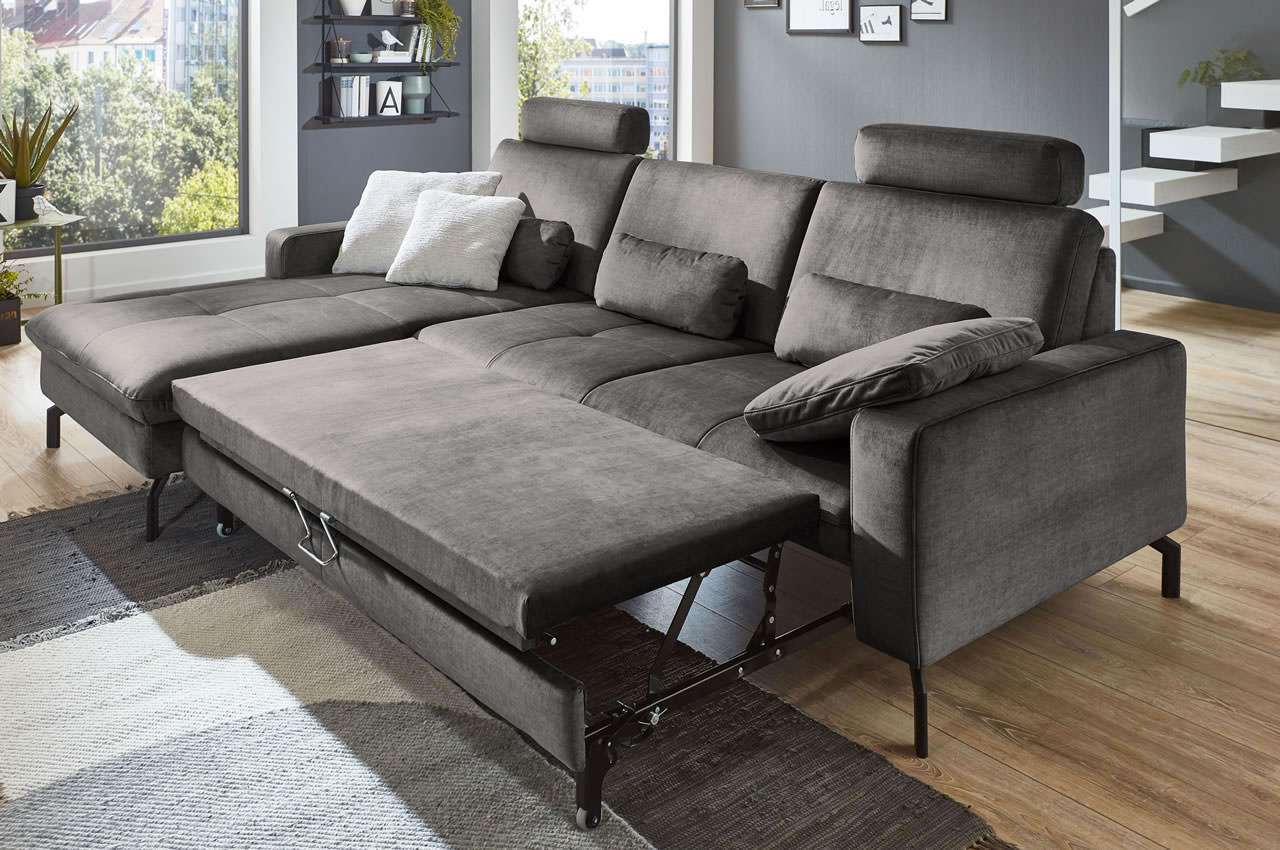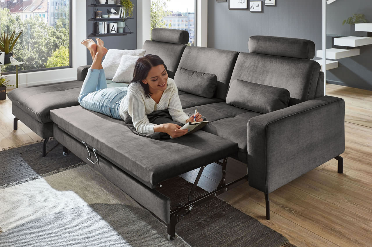 - Mit Schlaffunktion: Die große Liegefläche, die sich aus dem Bettauszug und der linksseitigen Recamiere ergibt, eignet sich hervorragend zum gemütlichen Kuscheln am Abend und bietet Ihren Gästen einen komfortablen Schlafplatz.