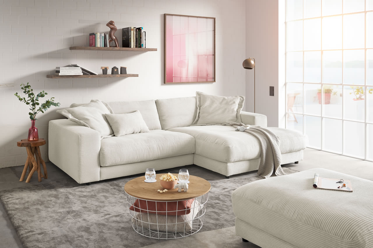 - Cord: Der Polsterstoff ist sehr hochwertig, robust und hat eine schöne Optik. Wählen Sie aus den Farben Dunkelgrau, Grau, Hellgrau, Nature, Snow, Taupe und Turtle.