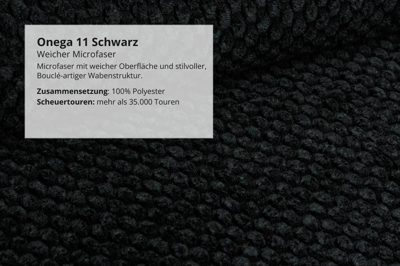 - Microfaser Onega: Der moderne Stoff besitzt eine griffige Oberfläche mit stilvoller Struktur. Wählen Sie aus den Farbvarianten 06 Petrol, 07 Grau, 08 Hellgrau, 09 Stahlblau, 11 Schwarz und 14 Beige.