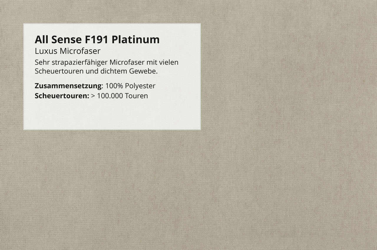 - Luxus Microfaser All Sense: Der Stoff ist aufgrund seines dichten Gewebes besonders pflegeleicht und strapazierfähig. Wählen Sie aus den Farbvarianten F180 Mud, F182 Schwarz, F185 Argent, F186 Stone, F190 Elefant, F191 Platinum und F196 Racing Green.
