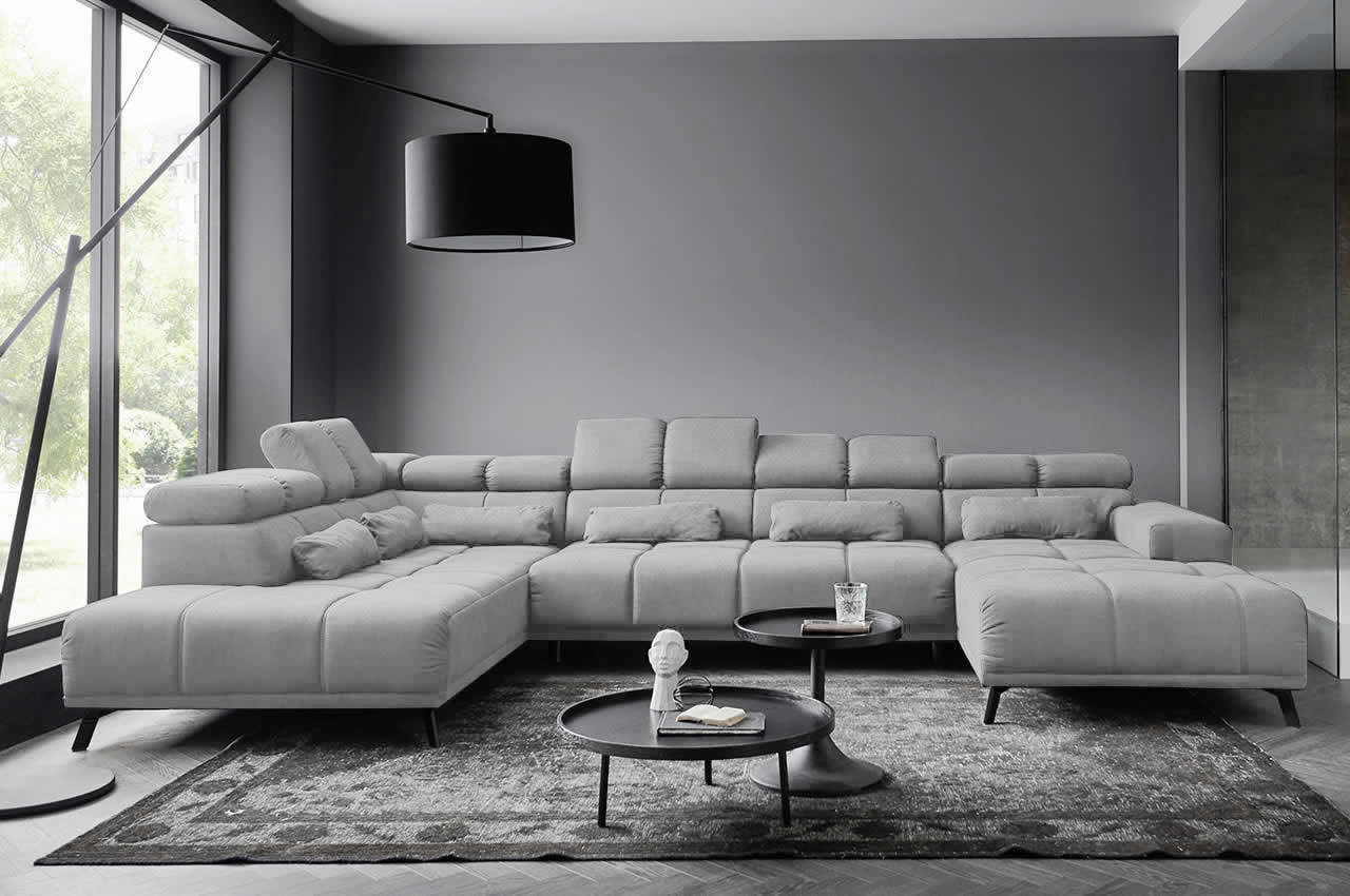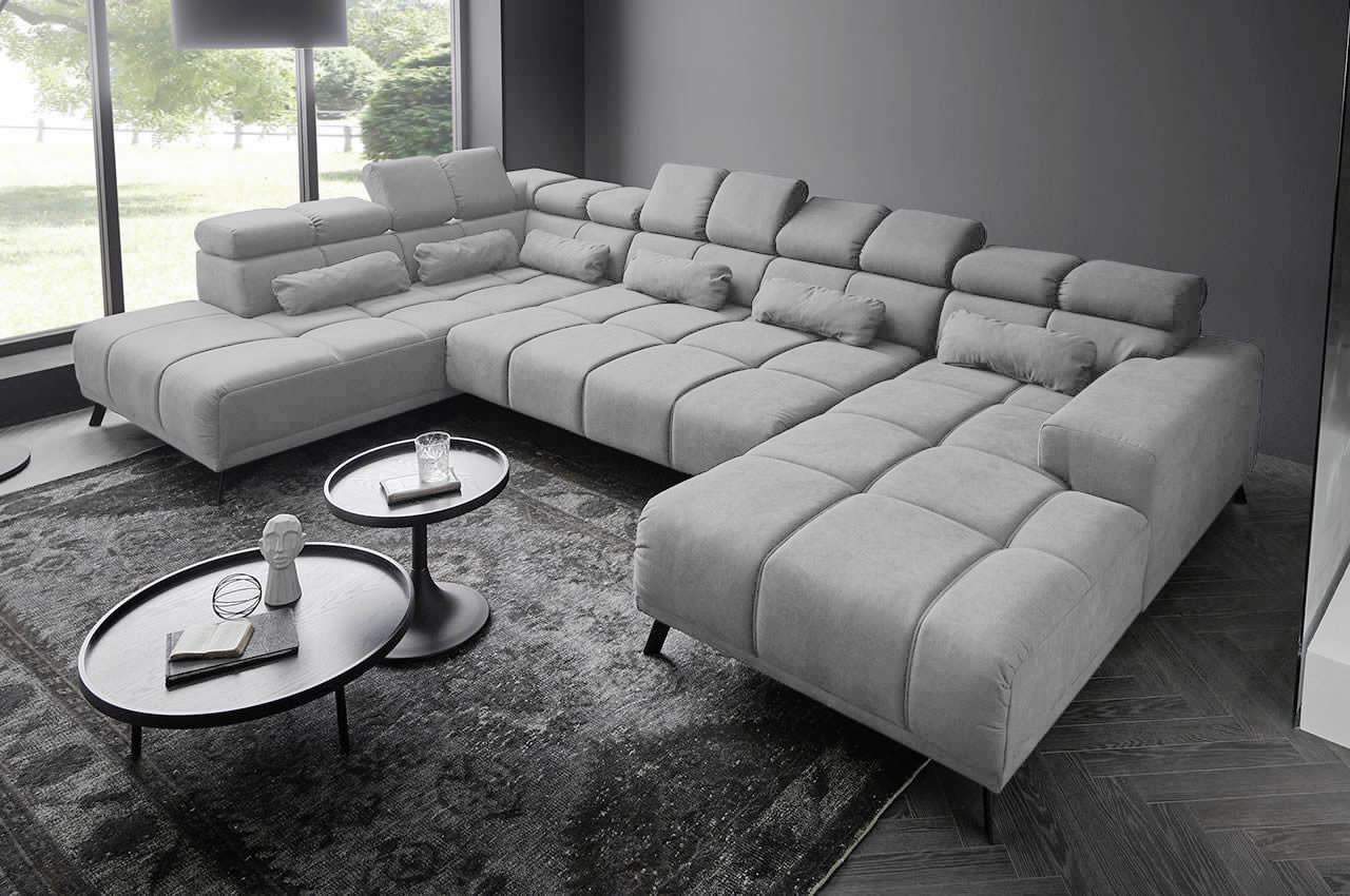 Die Wohnlandschaft Speed überzeugt mit ihrem modernen Design und einer beeindruckenden Größe, die jede Menge Platz für entspannte Abende mit Freunden und Familie bietet. Mit ihrer klaren Form und der stilvollen Steppung wird sie zum Blickfang in Ihrem Wohnzimmer und lädt zum gemütlichen Verweilen ein.