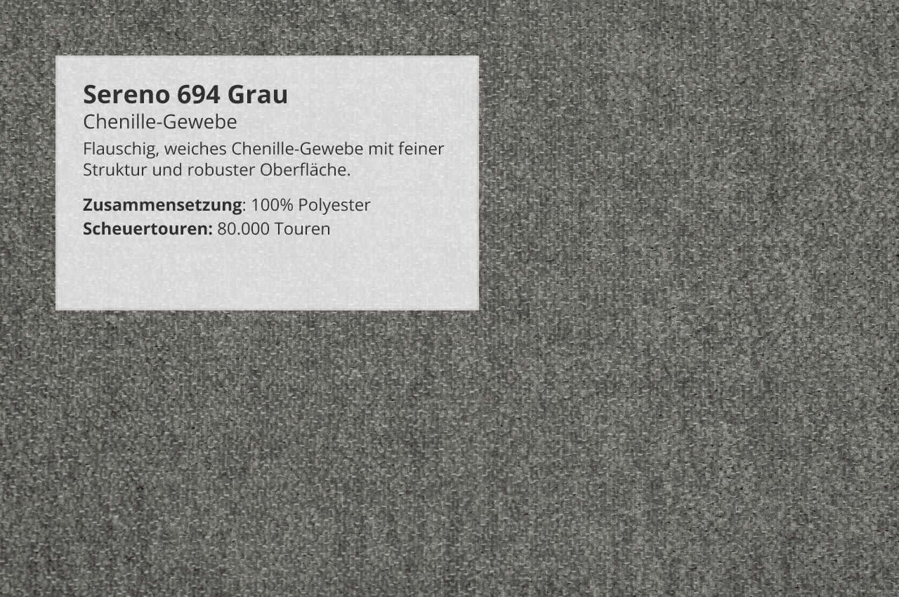 - Chenille-Gewebe Sereno: Der Bezug besitzt eine hohe Abriebfestigkeit mit leicht flauschiger, weich strukturierter Oberfläche.