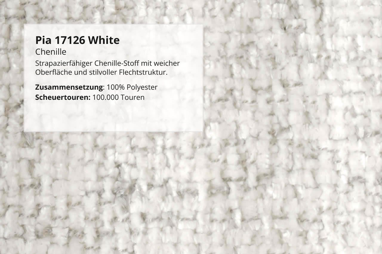 - Chenille-Stoff Pia: Ein äußerst strapazierfähiger Stoff mit flauschig-weicher Haptik und einer stilvollen Flechtstruktur. Er verleiht dem Sofa eine elegante, gemütliche Note und ist zugleich langlebig und pflegeleicht.