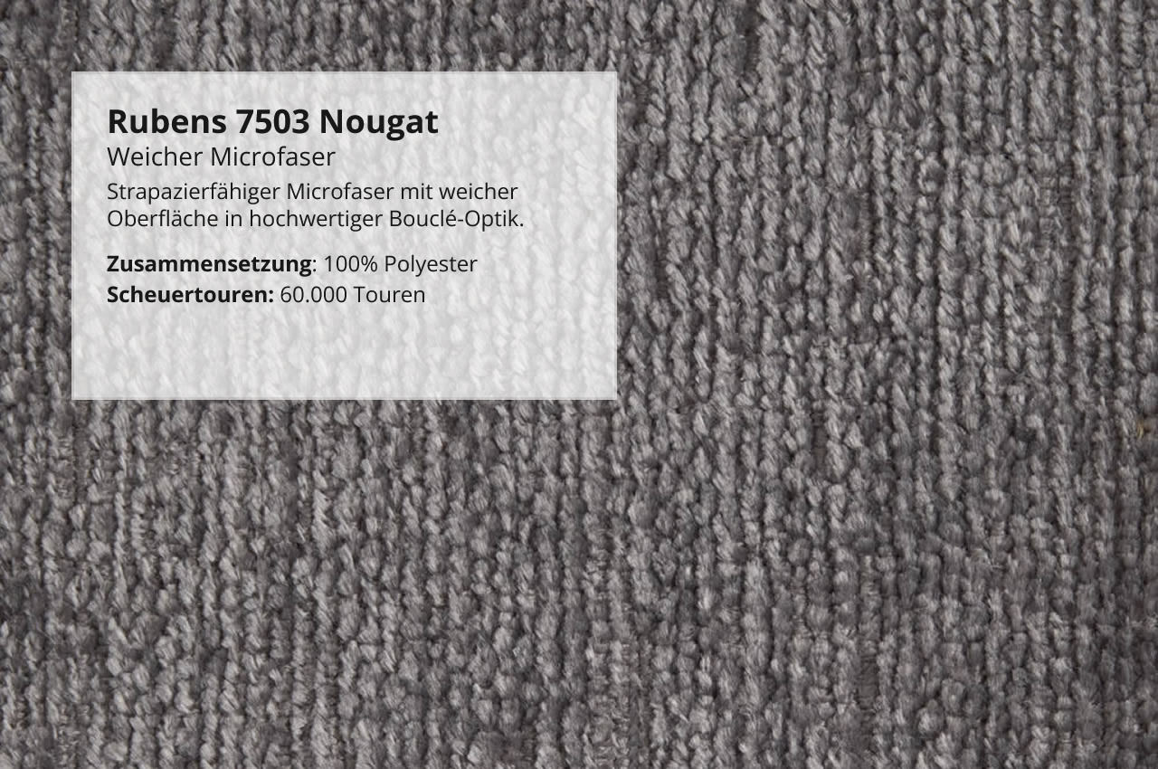 - Weicher Microfaser Rubens: Ein strapazierfähiger, angenehm weicher Microfaserbezug mit moderner Bouclé-Optik. Er sorgt für einen gemütlichen Look, fühlt sich warm und einladend an und ist zugleich pflegeleicht – ideal für Familien.