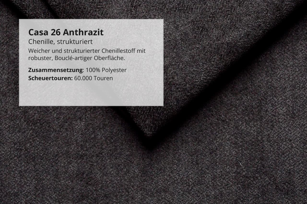 - Chenille Casa: Der Stoff ist angenehm weich und hat eine strukturierte Oberfläche in leichter Bouclé-artiger Optik.