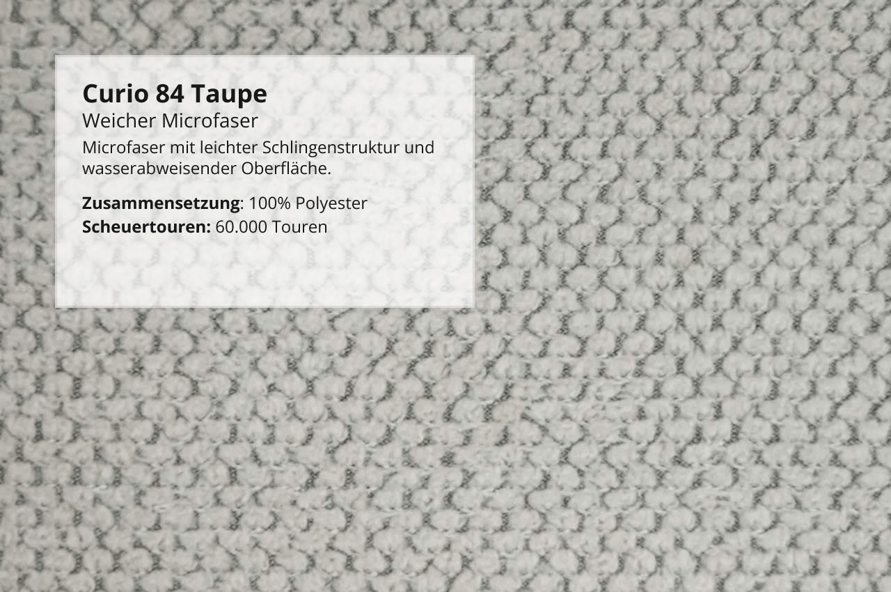 - Weicher Microfaser Curio: Weich im Griff mit moderner, leichter Schlingenstruktur. Zudem wasserabweisend und ideal für Haushalte, in denen der Bezug besonders leicht zu reinigen sein soll.