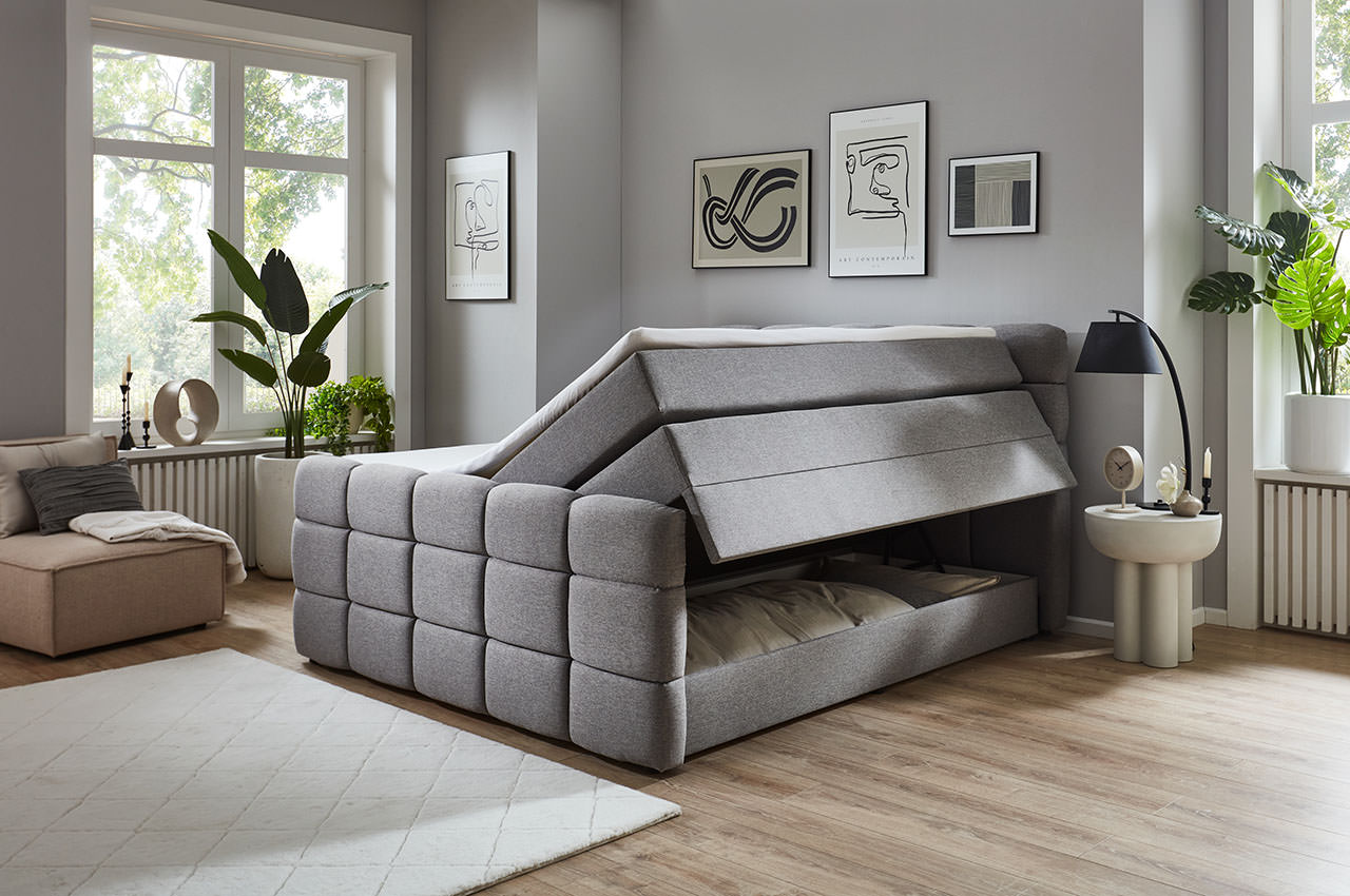 - Zwei geräumige Bettkästen: Die seitlich zu öffnenden Bettkästen bieten großzügigen Stauraum für Bettwäsche, Kissen und andere Textilien. Sie sind innen weiß beschichtet und lassen sich dank Gasdruckfedern leicht und komfortabel bedienen – ideal, um Ordnung und zusätzlichen Platz im Schlafzimmer zu schaffen.