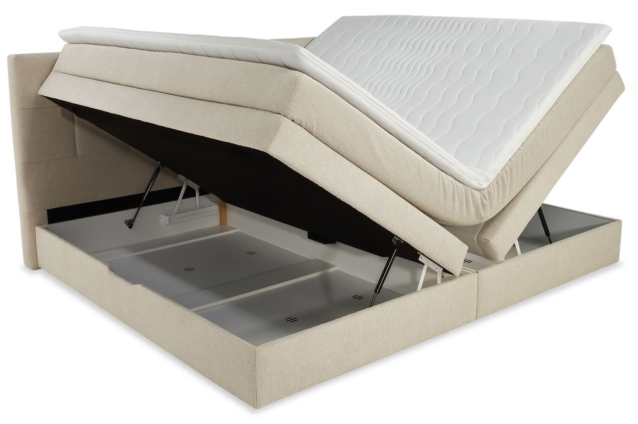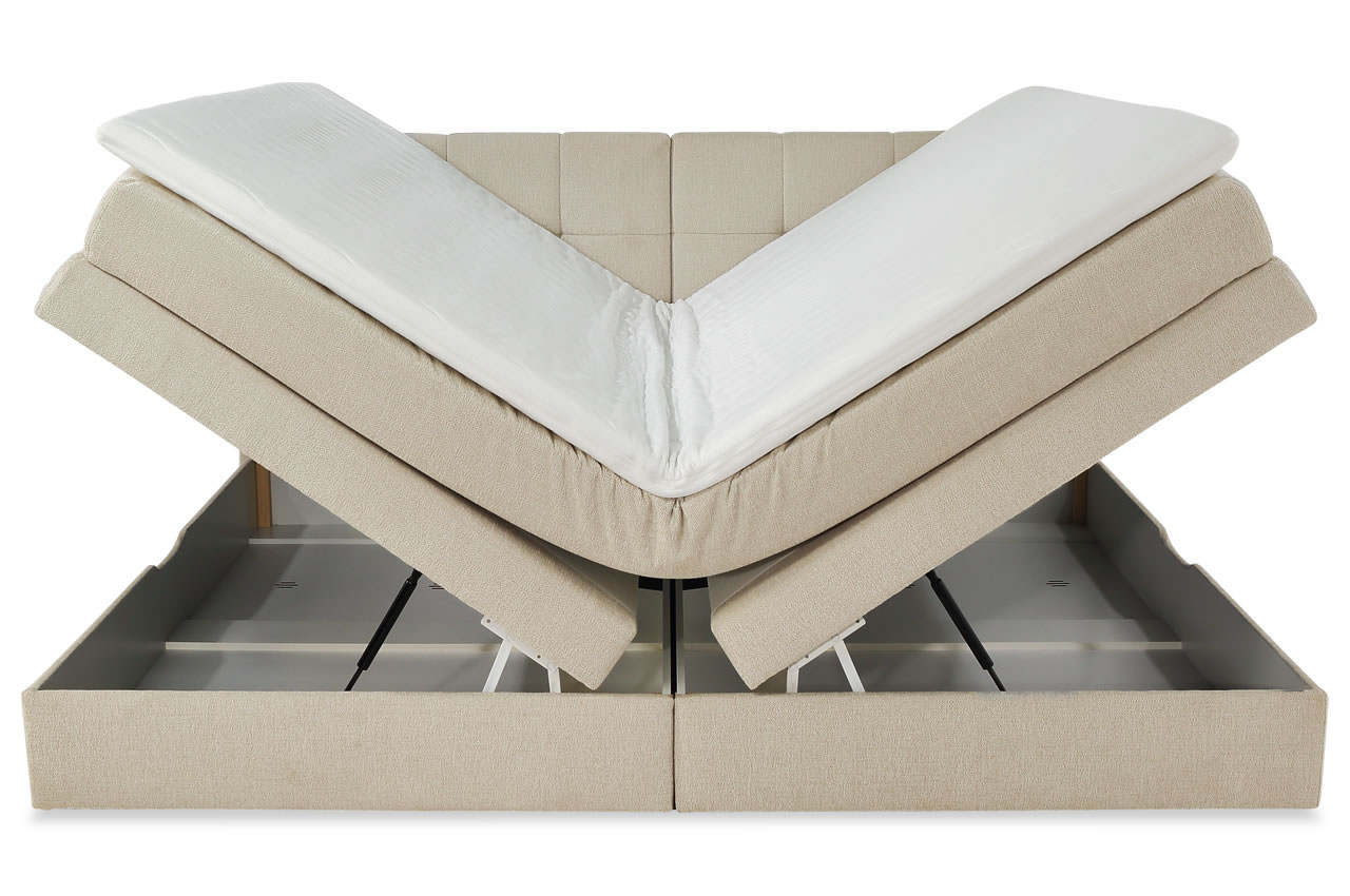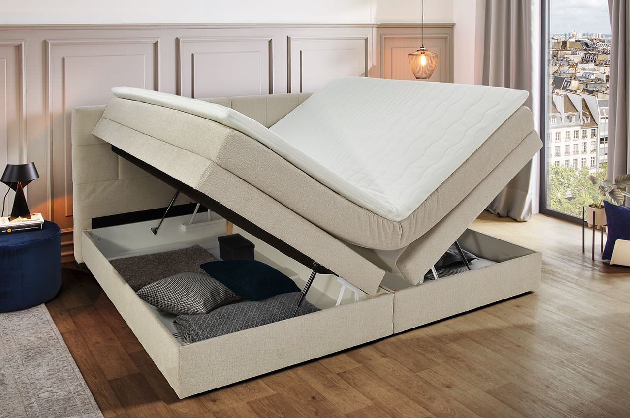 - Bonell-Unterboxen: Die stabile Unterbox ist mit einer Bonell-Federkernpolsterung ausgestattet, die als tragende Federung dient und die Grundlage für den angenehmen Liegekomfort bildet. Sie sorgt für eine flächige Unterstützung und schafft die Basis für die darüberliegende Tonnentaschenfederkernmatratze.