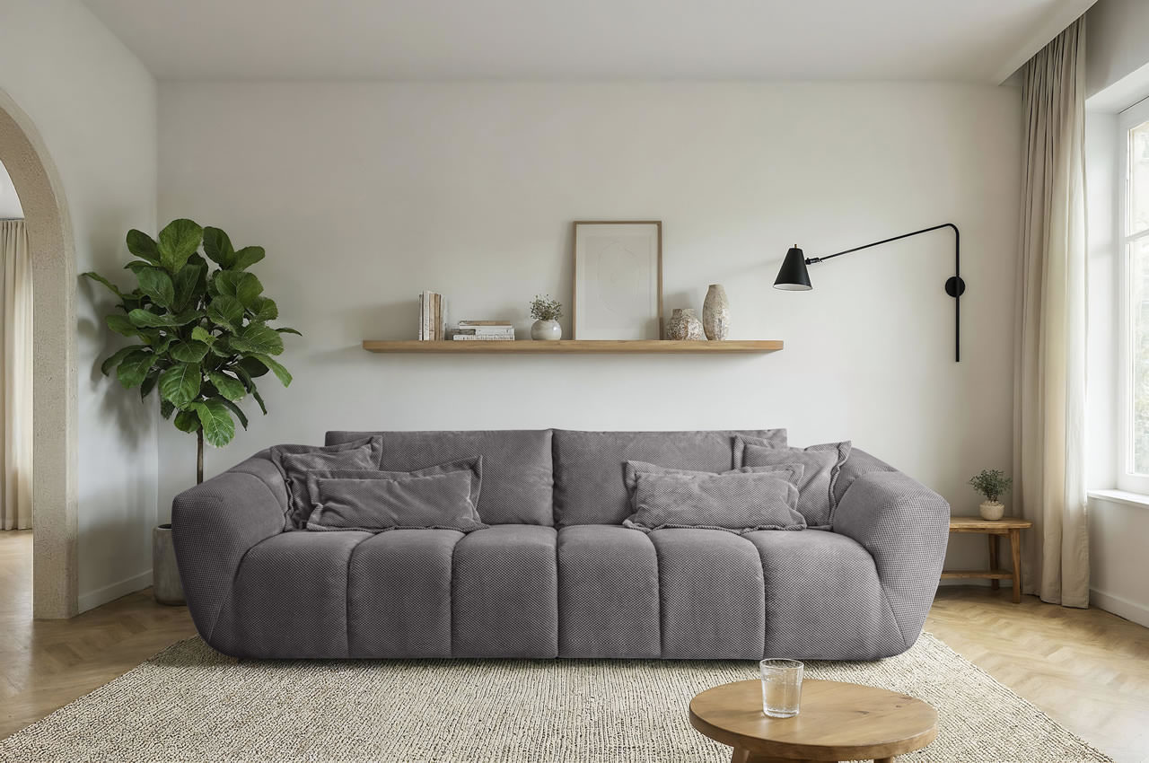 - Bodennahe Bauweise: Die niedrige Konstruktion unterstreicht den modernen Lounge-Charakter des Bigsofas und verstärkt die entspannte, einladende Wirkung im Raum.