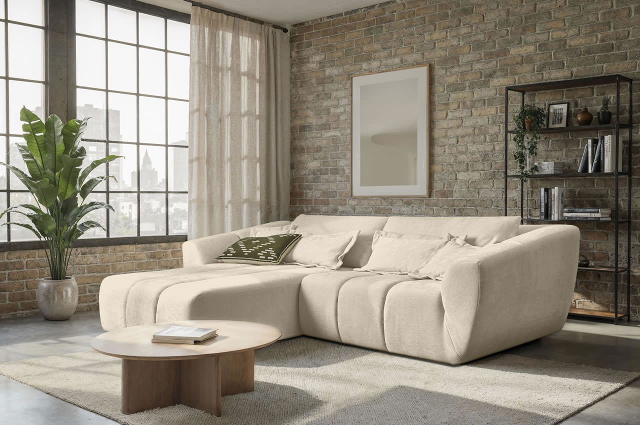 - Bodennahe Bauweise: Die niedrige Konstruktion unterstreicht den modernen Lounge-Charakter des Ecksofas und verleiht ihm eine besonders entspannte, wohnliche Wirkung.