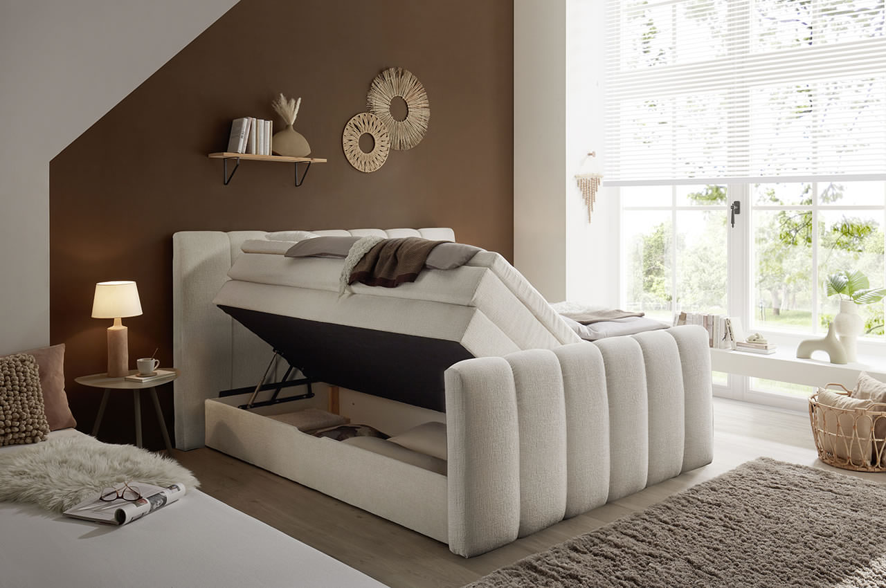 - Zwei Bettkästen: Die integrierten Bettkästen bieten viel Stauraum für Decken, Kissen oder Bettwäsche. So bleibt das Schlafzimmer ordentlich und wichtige Utensilien sind jederzeit griffbereit verstaut.