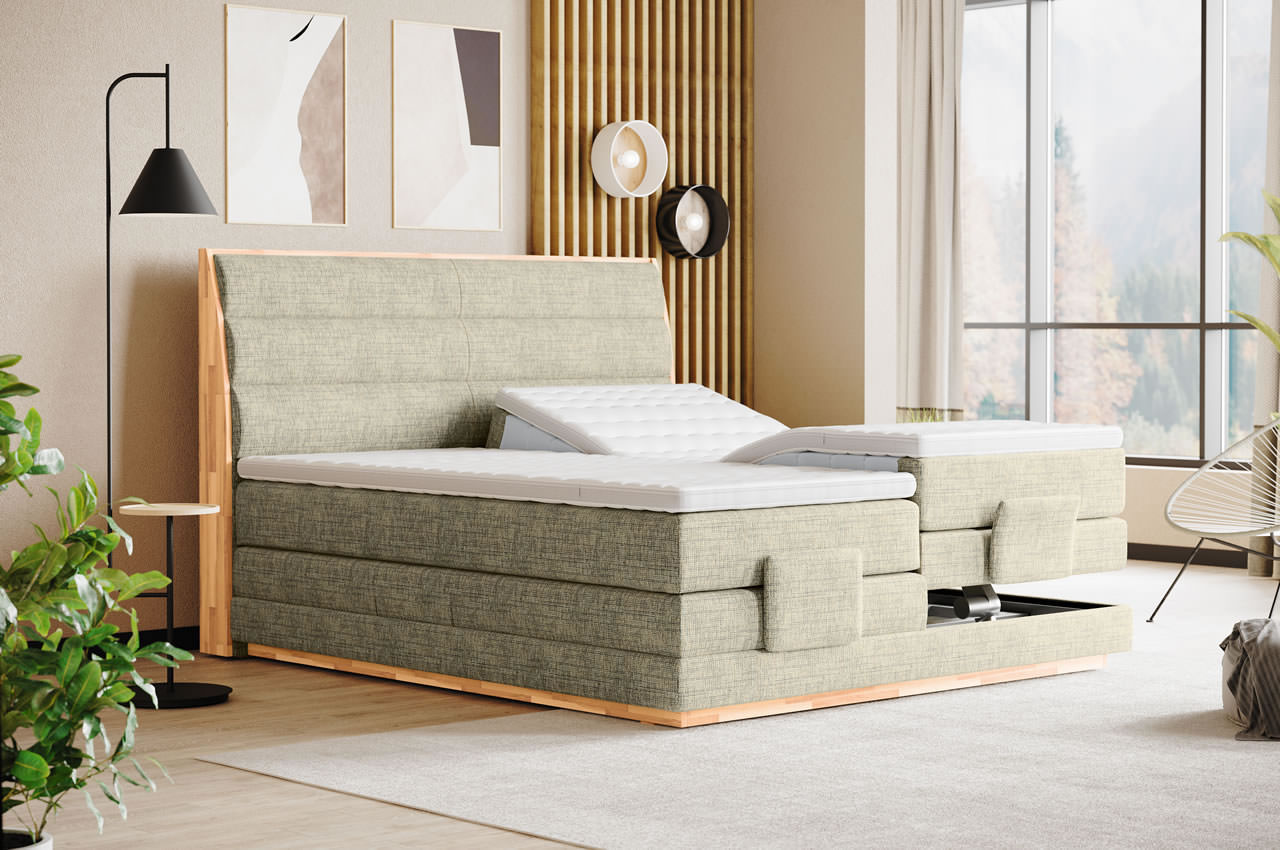 - Optional mit motorischer Kopf- und Fußteilverstellung: Das Bett ist alternativ mit einer motorischen Verstellung von Kopf- und Fußteil erhältlich. Beide Bereiche lassen sich unabhängig voneinander in verschiedene Positionen einstellen. In dieser Ausführung verfügt das Bett über spezielle Stopper am Fußteil, die ein Verrutschen der Matratzen beim Verstellen verhindern.