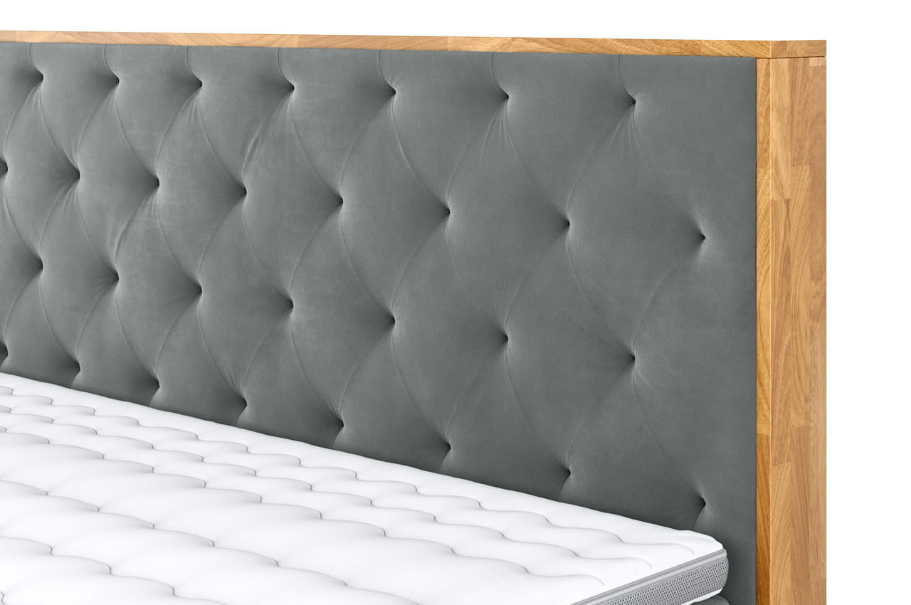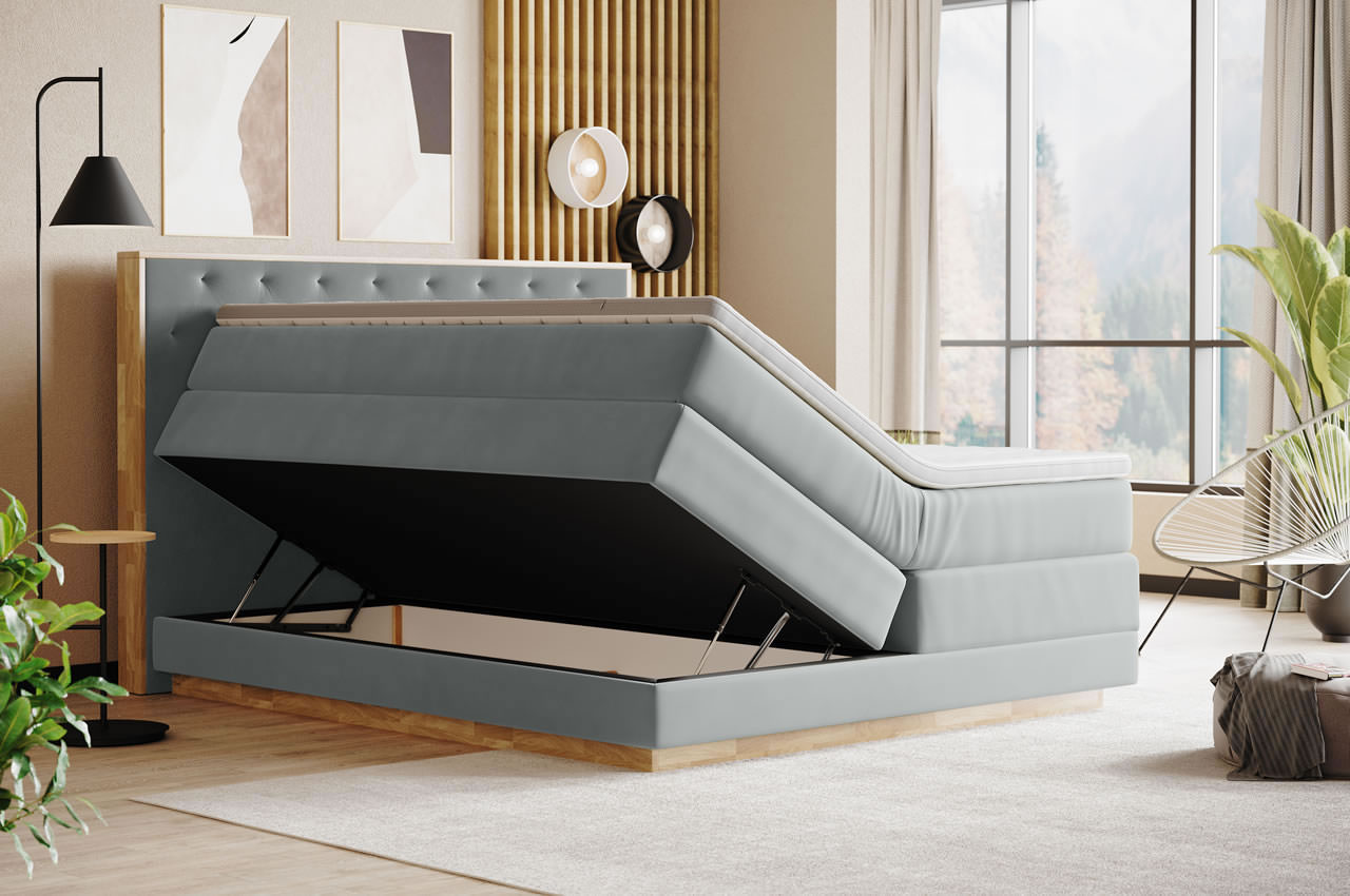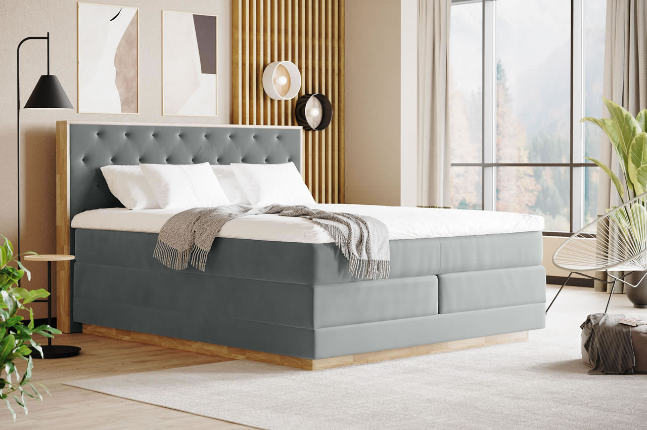 Das Boxspringbett Palma II präsentiert sich als stilvolle und moderne Schlaflösung für Paare, die Wert auf Design und Komfort legen. Erhältlich in drei Bettgrößen, lässt sich das Modell flexibel an unterschiedliche Raumgrößen anpassen. Ein besonderes Highlight ist das hochwertig verarbeitete Kopfteil mit eleganter Heftsteppung, das von einem markanten, breiten Holzrahmen eingefasst wird. Auch die Unterboxen greifen dieses Detail auf und sind umlaufend in Holz gerahmt.