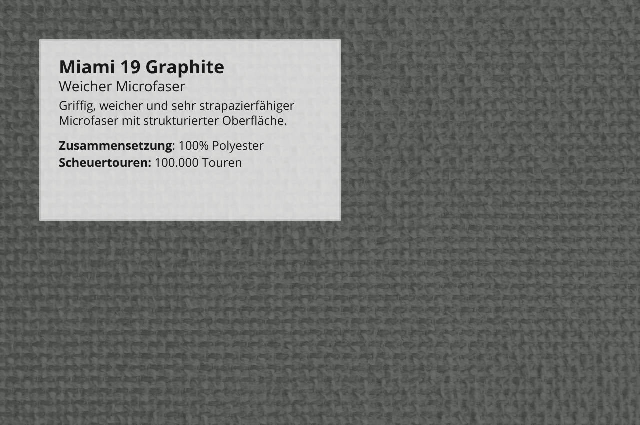 - Weicher Microfaser Miami: Ein griffig weicher, strukturierter Microfaserstoff mit hoher Strapazierfähigkeit. Pflegeleicht, langlebig und ideal für den Alltag geeignet.