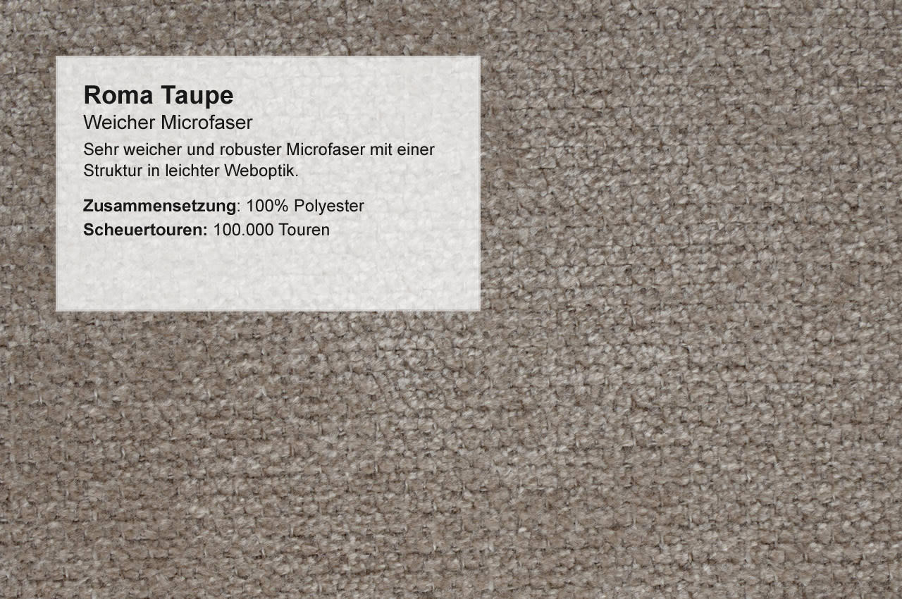 - Microfaser Roma: Der angenehm weiche Stoff überzeugt durch seine samtige Oberfläche und die dezente, gewebte Struktur, die dem Sofa eine moderne und wohnliche Ausstrahlung verleiht.