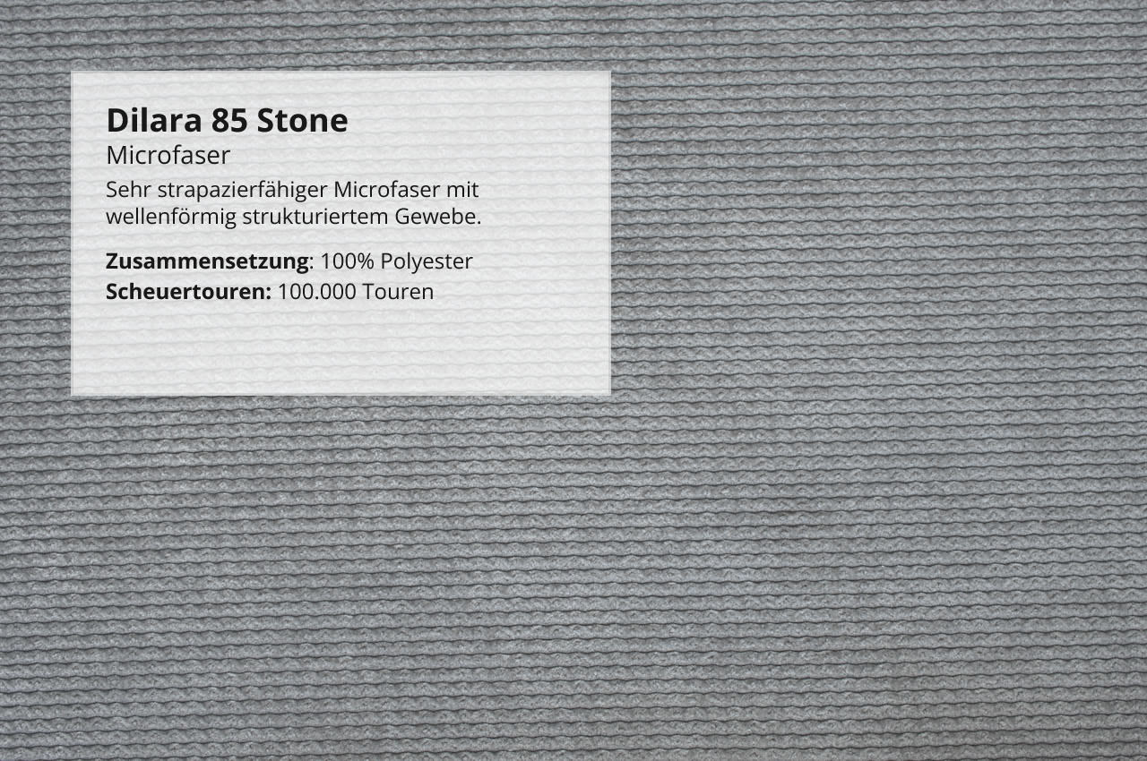 - Microfaser Dilara: Der Stoff hat eine cordähnliche Wellenstruktur, fühlt sich angenehm weich an und überzeugt durch seine hohe Strapazierfähigkeit.