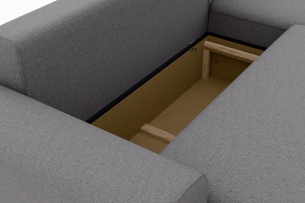 - Schlaffunktion und Bettkasten: Die Sitzfläche lässt sich nach vorn ausziehen und bildet zusammen mit der umgeklappten Rückenlehne eine Liegefläche für ein bis zwei Personen. Im Bettkasten unter der vorgezogenen Sitzfläche lassen sich Decken und Kissen verstauen.