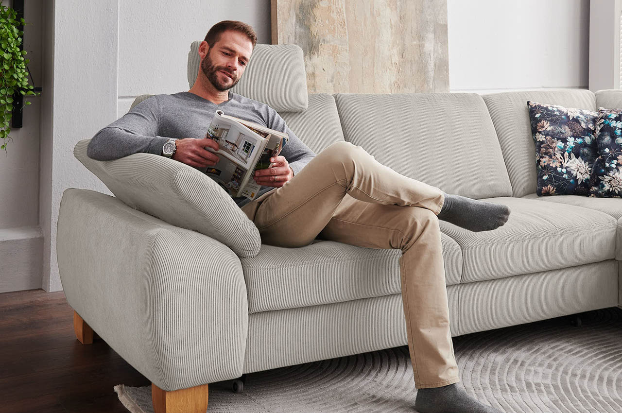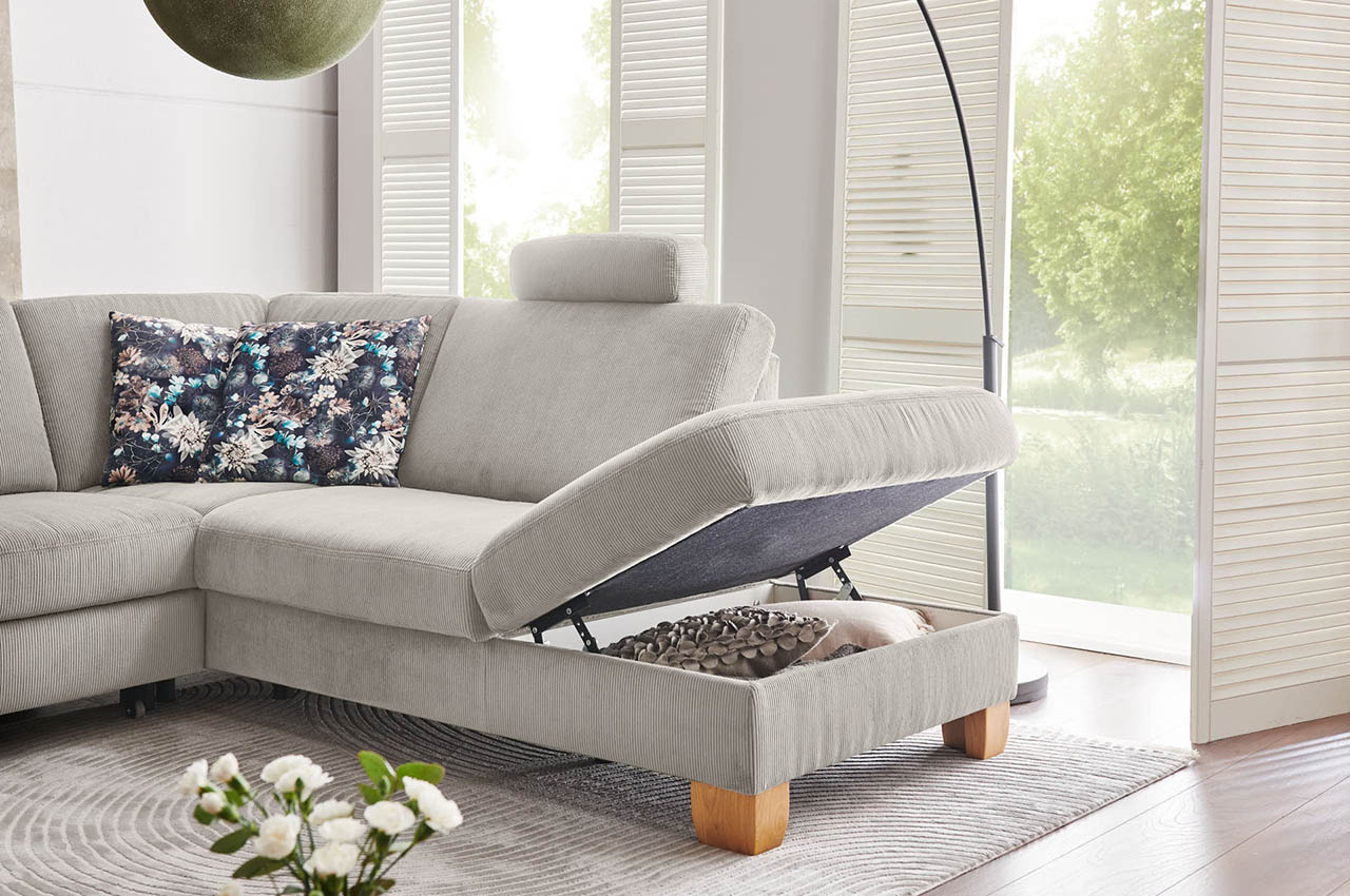 - Schlaffunktion, Bettkasten und Armteilverstellung (optional): Neben Bettauszug und Stauraum bietet diese Variante ein mehrstufig verstellbares Armteil auf der linken Seite, das den Komfort beim Liegen zusätzlich erhöht.