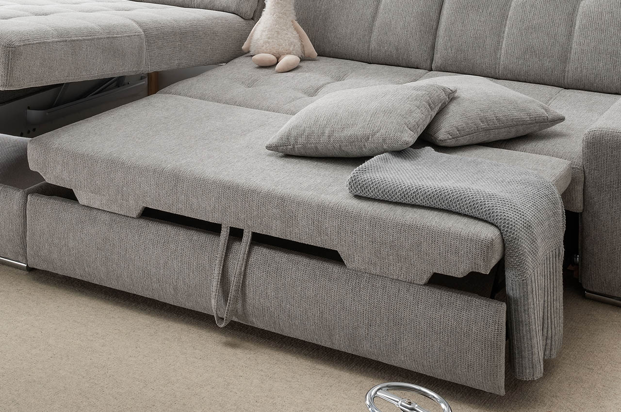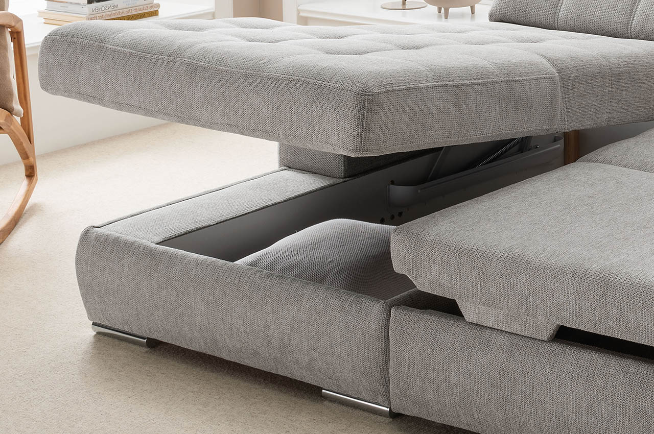 - Schlaffunktion und Bettkasten (optional): Mit der optionalen Schlaffunktion lässt sich das Sofa als Gästebett nutzen. Zusätzlich bietet der Bettkasten unter der Recamiere Platz für Bettwäsche und Decken.