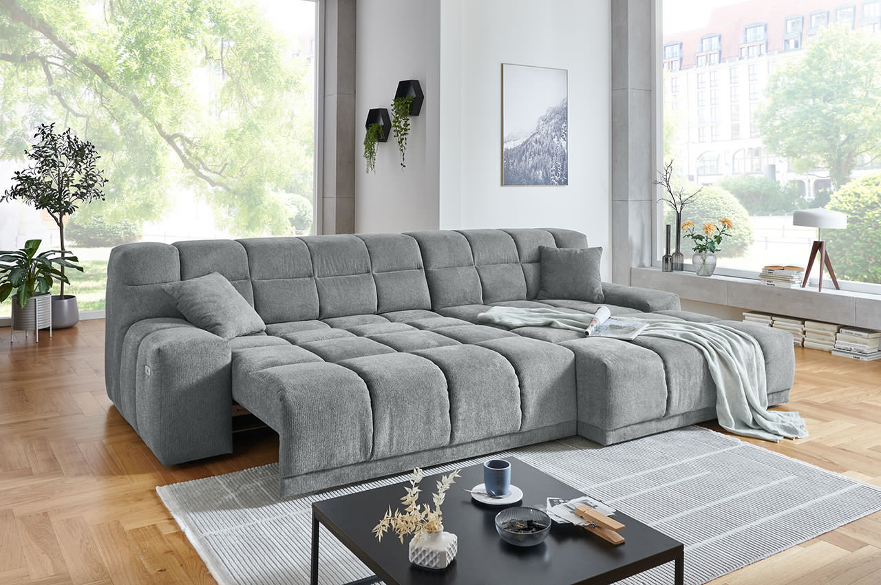 - Elektrische XXL-Sitztiefenverstellung (inklusive): Die Sitzfläche lässt sich per Knopfdruck um bis zu 60 cm ausfahren. So entsteht eine großzügige Liegefläche von 125x243 cm – optimal zum entspannten Fernsehen, Lesen oder auch für eine erholsame Nacht auf dem Sofa.