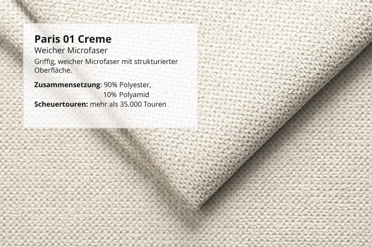 • Weicher Microfaser Paris: Dieser Stoff kombiniert eine griffige, weiche Haptik mit einer strukturierten Oberfläche für ein besonders wohnliches Gesamtbild.