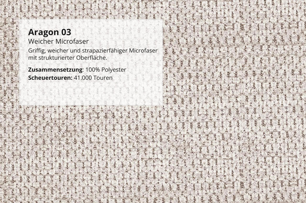 - Weicher Microfaser Aragon: Der griffig, weiche Stoff überzeugt mit einer strapazierfähigen Oberfläche und stilvoller Struktur. Er ist pflegeleicht und somit perfekt geeignet für Haushalte mit Kindern oder Haustieren.