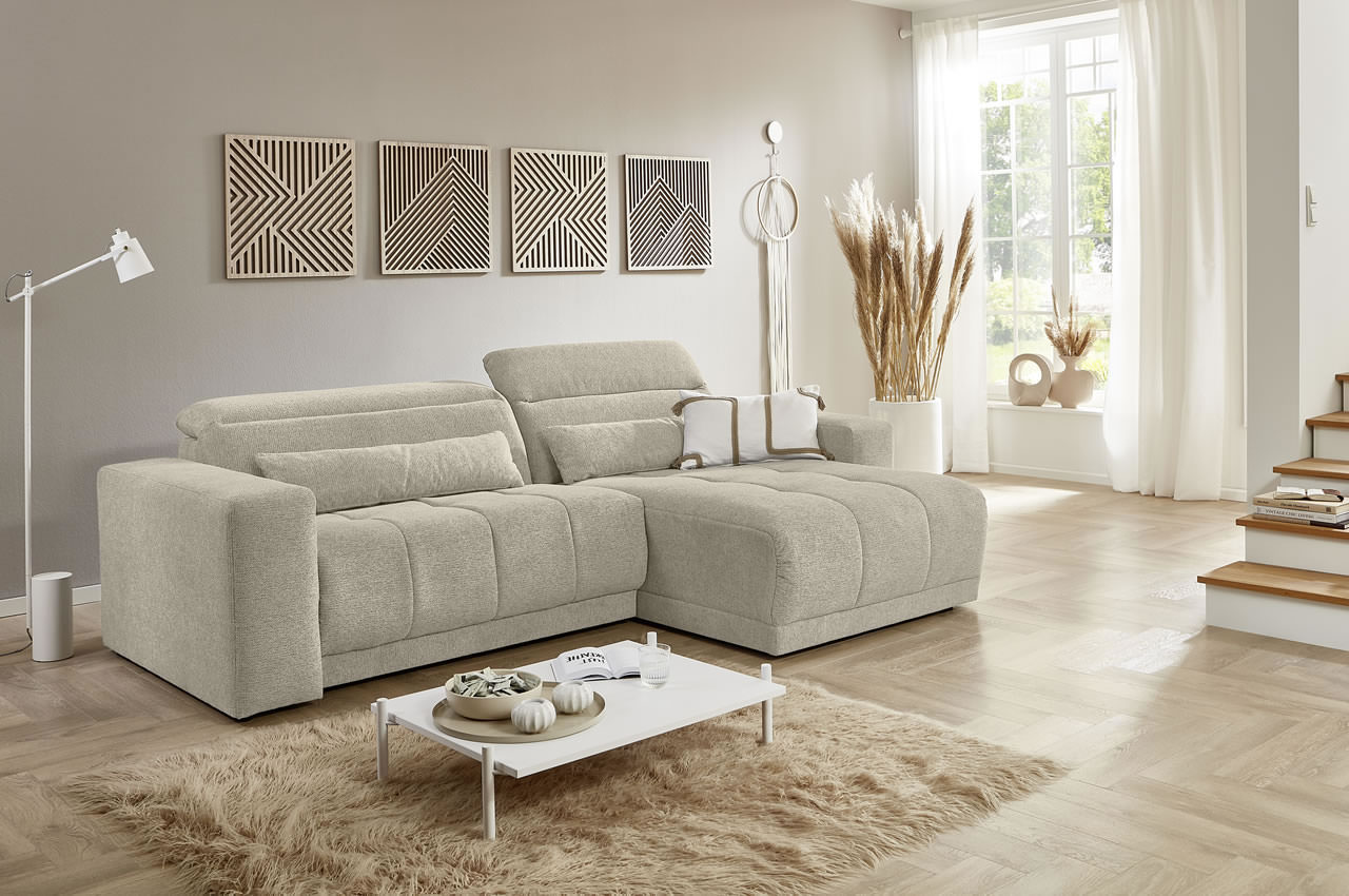 Das Ecksofa Luisa überzeugt mit einem modernen, geradlinigen Design und einer dezent gesteppten Sitzfläche, die dem Sofa eine stilvolle Note verleiht. Dank seiner komfortablen Größe – weder zu groß noch zu klein – passt es perfekt in viele Wohnräume und wird mit seinen Komfortfunktionen schnell zum neuen Lieblingsplatz in jedem Zuhause.