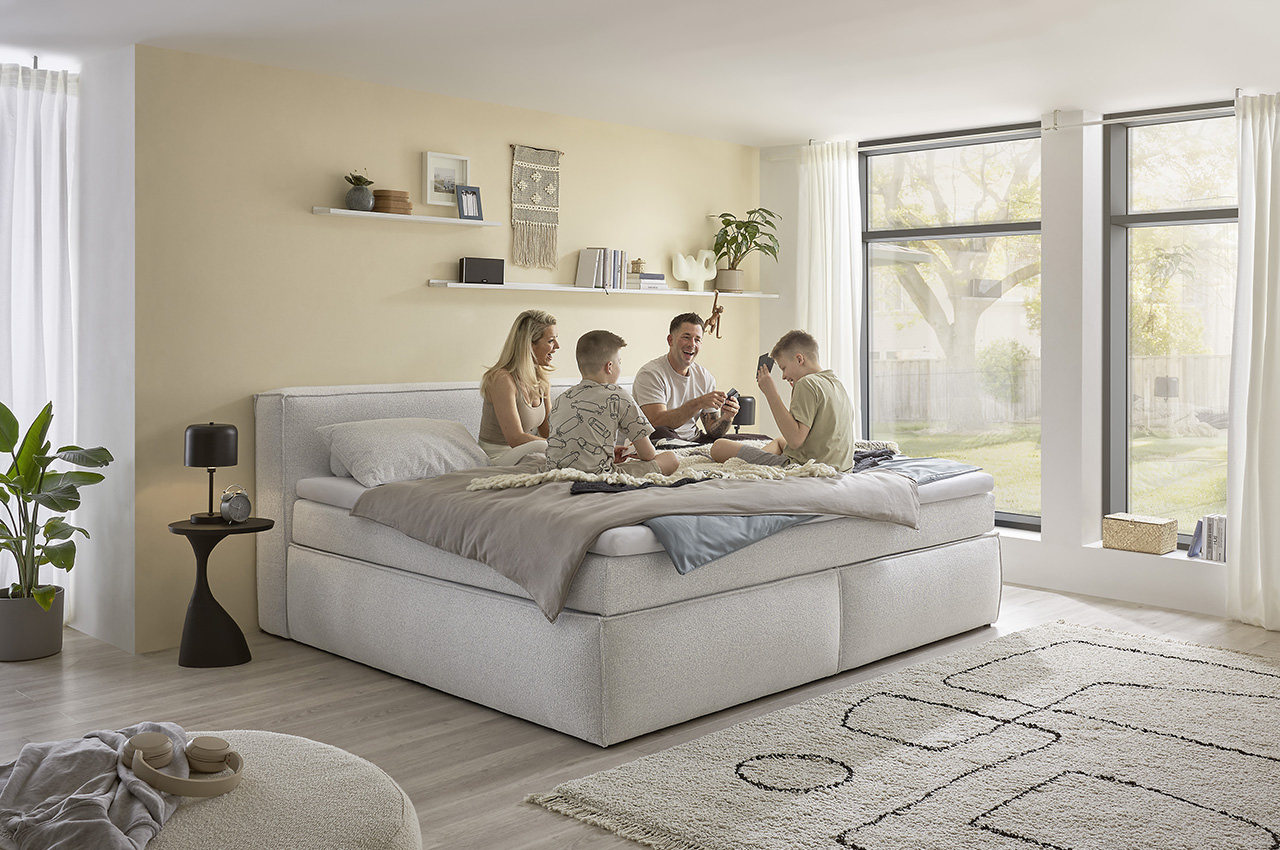 Das Boxspringbett Sandon mit einer großzügigen Liegefläche von 240x200 cm ist die ideale Lösung für alle, die besonders viel Platz zum Schlafen schätzen. Als gemütliches Familienbett bietet es ausreichend Raum für Eltern und Kinder oder für Paare, die maximale Bewegungsfreiheit wünschen. Das minimalistisch-moderne Design mit stilvoller Kederverarbeitung verleiht dem Bett eine elegante, zeitlose Optik, die sich harmonisch in moderne Schlafzimmer einfügt.