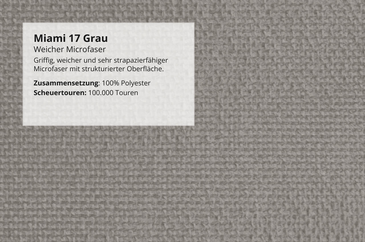 - Weicher Microfaser Miami: Ein angenehm weicher Stoff mit stilvoller Struktur und sehr hoher Abriebfestigkeit. Robust, pflegeleicht und bestens für den täglichen Gebrauch geeignet.