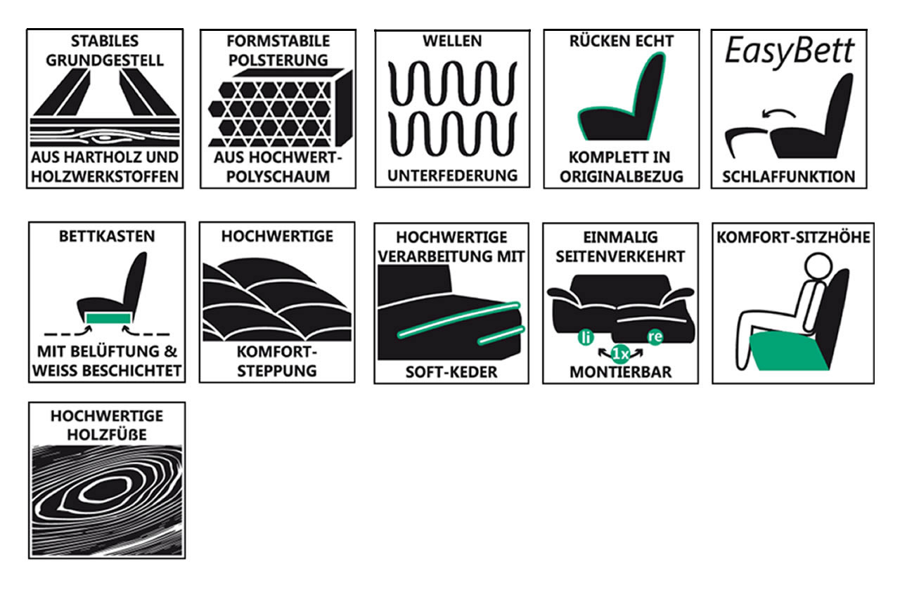 - Schlaffunktion: Dank der Easy-Bett-Funktion lässt sich die Sitzfläche besonders leicht ausziehen. So entsteht im Handumdrehen eine komfortable Liegefläche von 230x133 cm, ideal für Gäste oder entspannte Abende.