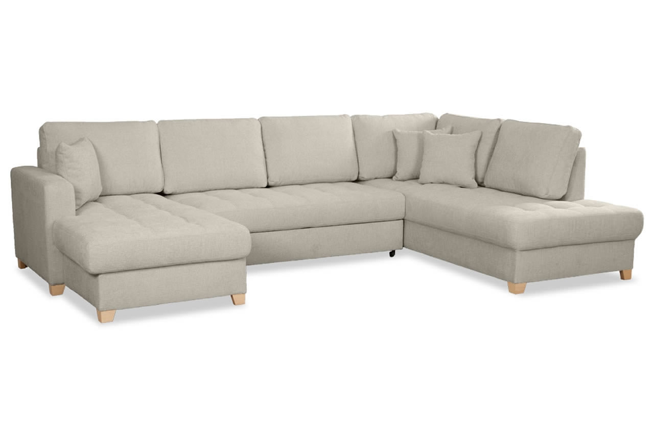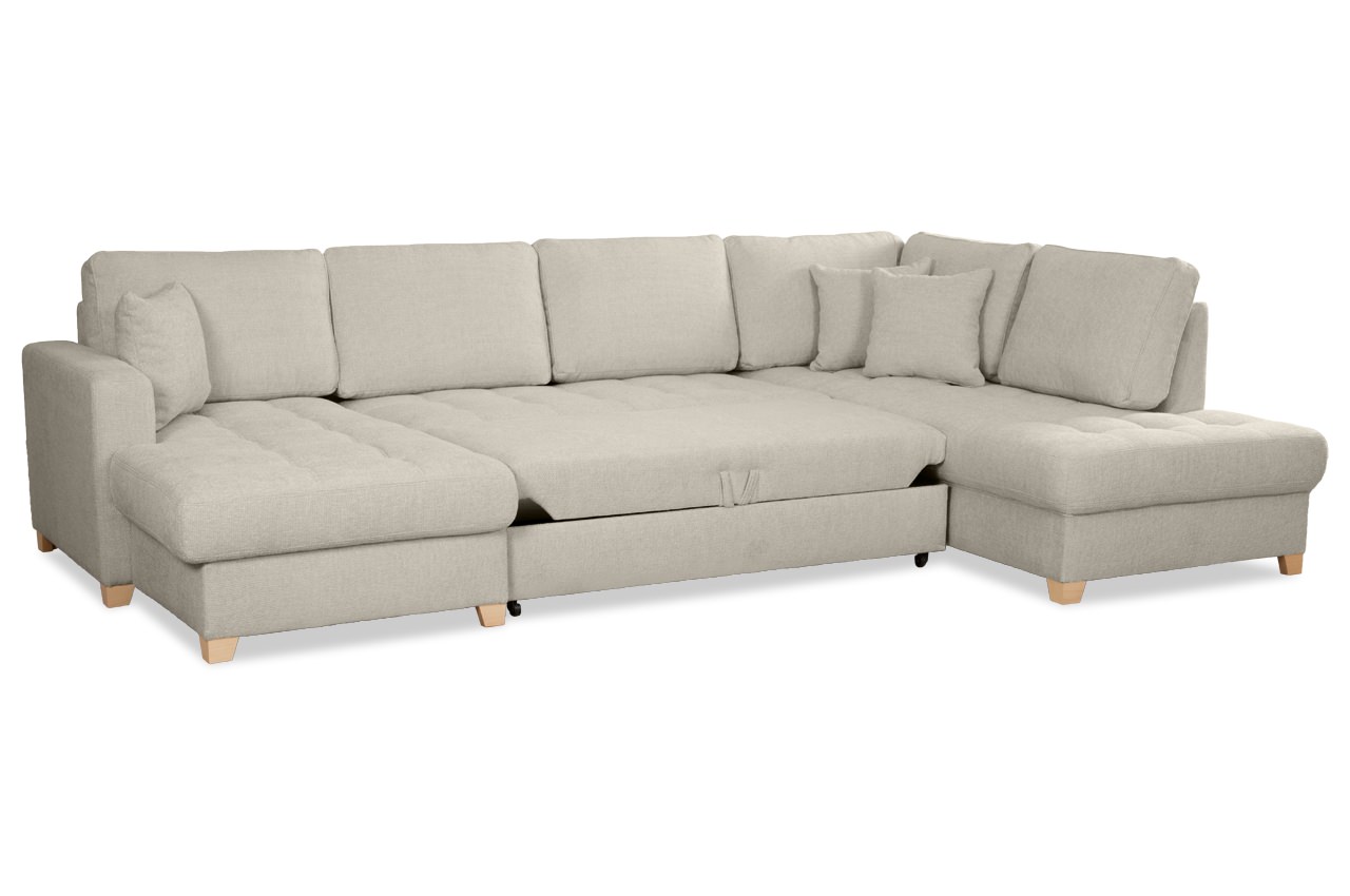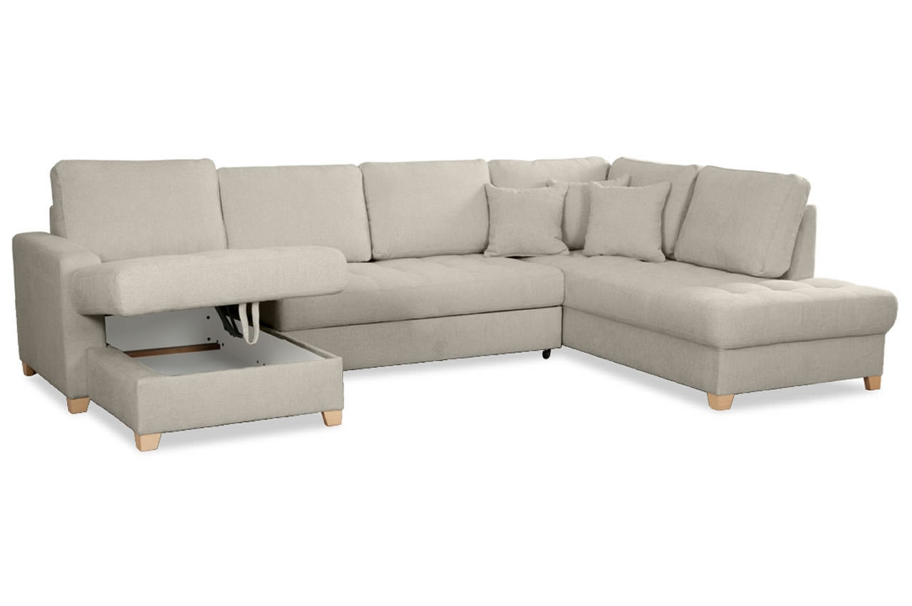 - Mit Schlaffunktion mit Bettkasten (optional): Neben der komfortablen Schlaffunktion erhalten Sie das Sofa mit einem integrierten Bettkasten, der sich unter der linksseitigen Recamiere befindet. Hier lassen sich Decken, Kissen oder Bettwäsche unterbringen.