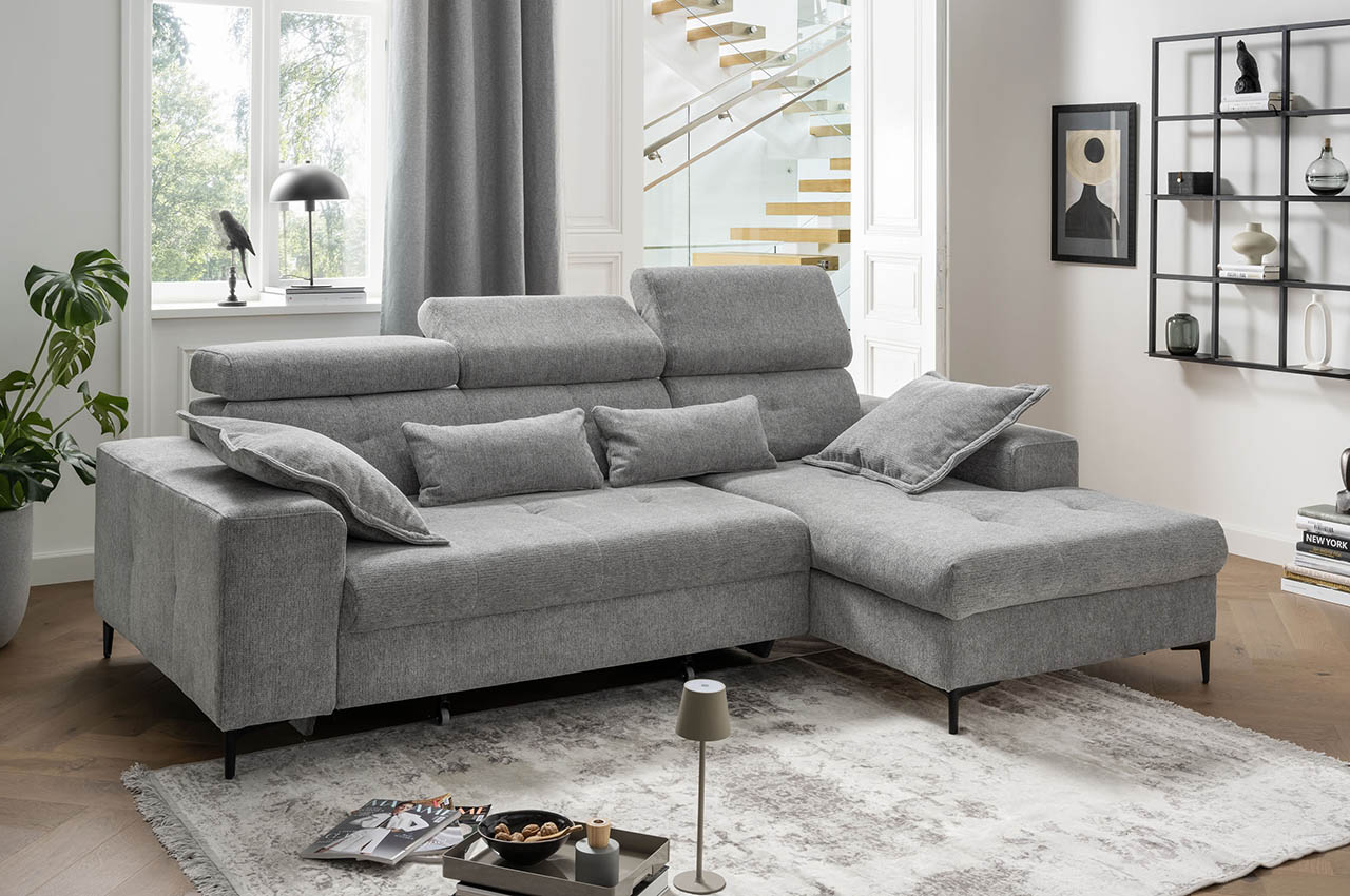 Das Ecksofa Neapel ist klar und modern gestaltet und zeigt eine kantige, geradlinige Form. Durch seine kompakte Größe lässt es sich gut in viele Wohnräume integrieren und eignet sich besonders auch für kleinere Wohnzimmer. Der Freiraum unter dem Sofa sorgt zusätzlich für eine leichte, offene Wirkung im Raum.