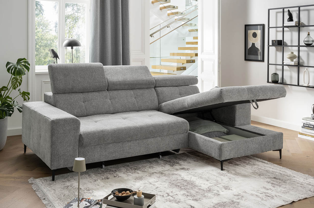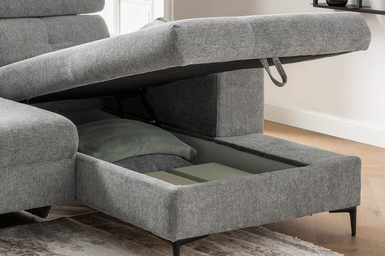 - Mit Bettkasten: Unter der Recamiere befindet sich ein geräumiger Stauraum, der sich über die gesamte Fläche erstreckt und viel Platz für Decken und Kissen bietet.