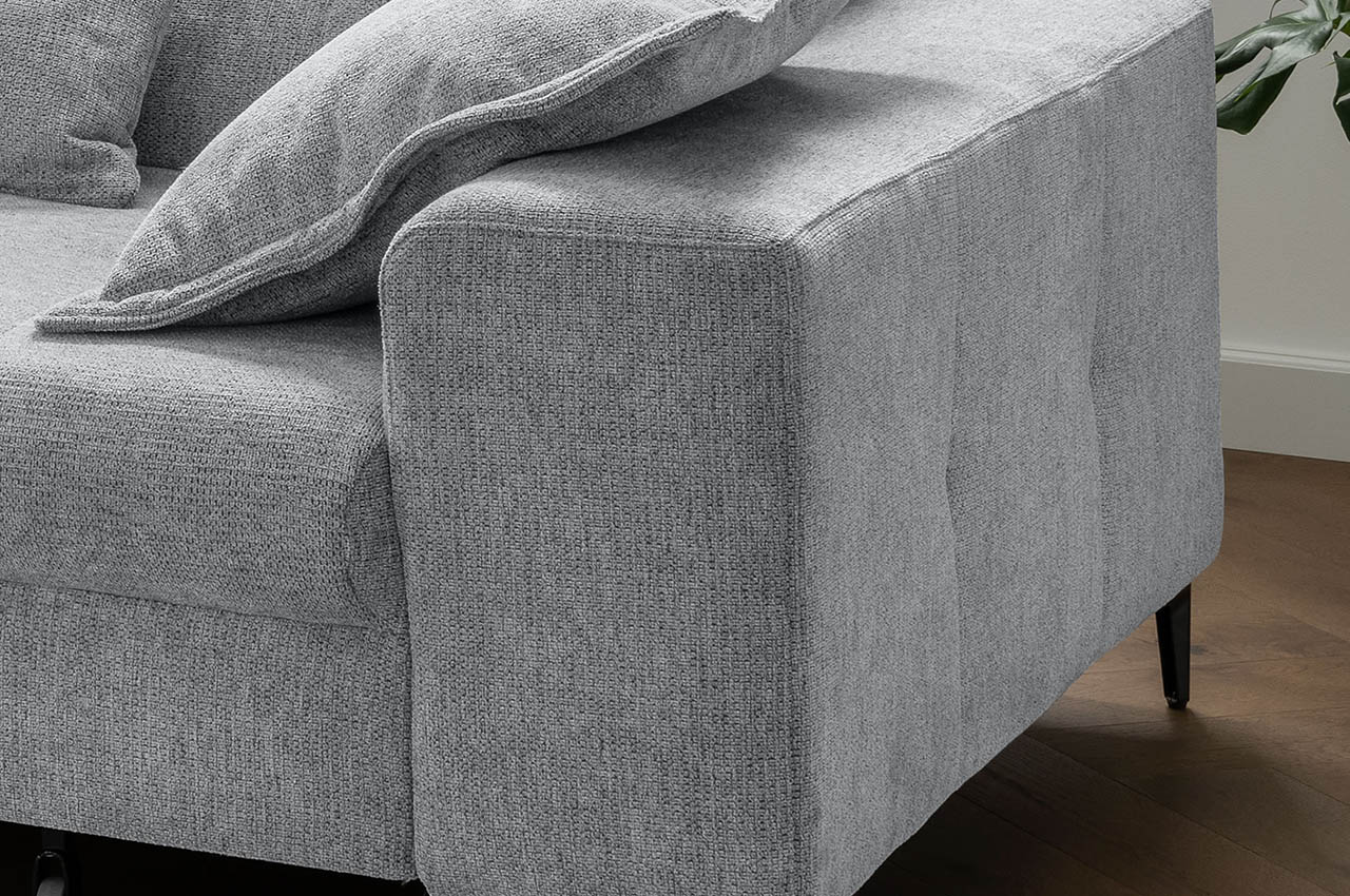 Das Ecksofa Neapel ist klar und modern gestaltet und zeigt eine kantige, geradlinige Form. Durch seine kompakte Größe lässt es sich gut in viele Wohnräume integrieren und eignet sich besonders auch für kleinere Wohnzimmer. Der Freiraum unter dem Sofa sorgt zusätzlich für eine leichte, offene Wirkung im Raum.