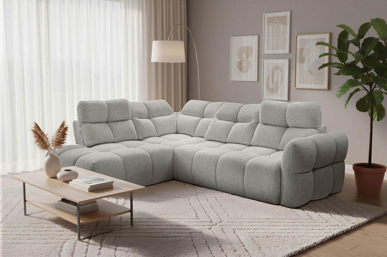 Das Ecksofa Calma zeigt eine weiche, moderne Form mit klarer Linienführung und markanter Steppung. Die Gestaltung wirkt ruhig und zugleich einladend. Durch seine ausgewogene Größe passt das Sofa sowohl in kleinere als auch in größere Wohnräume und lässt sich vielseitig integrieren.